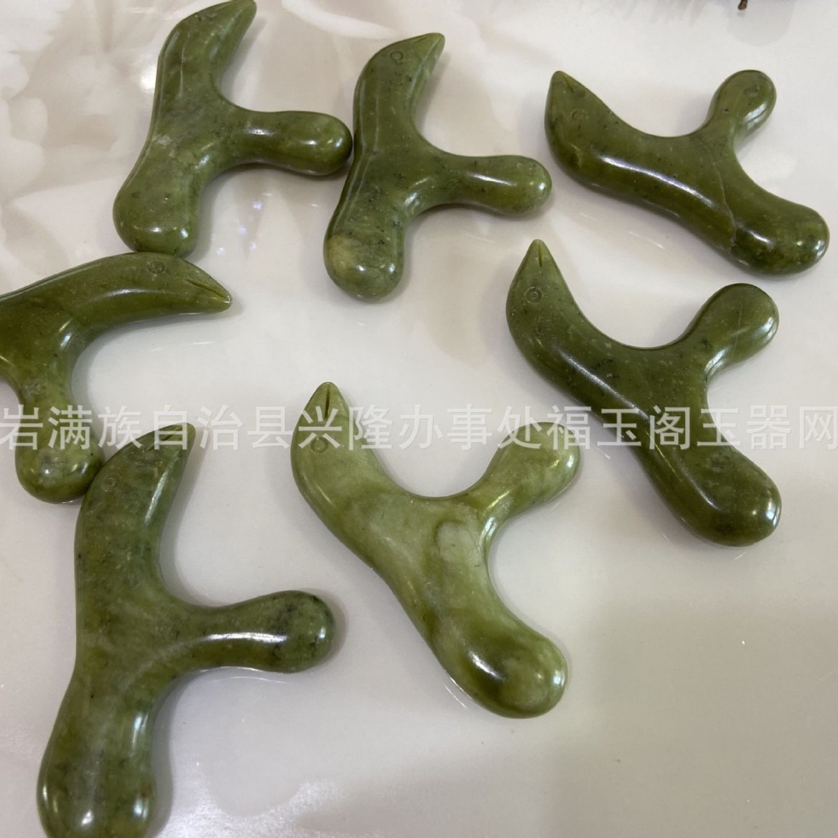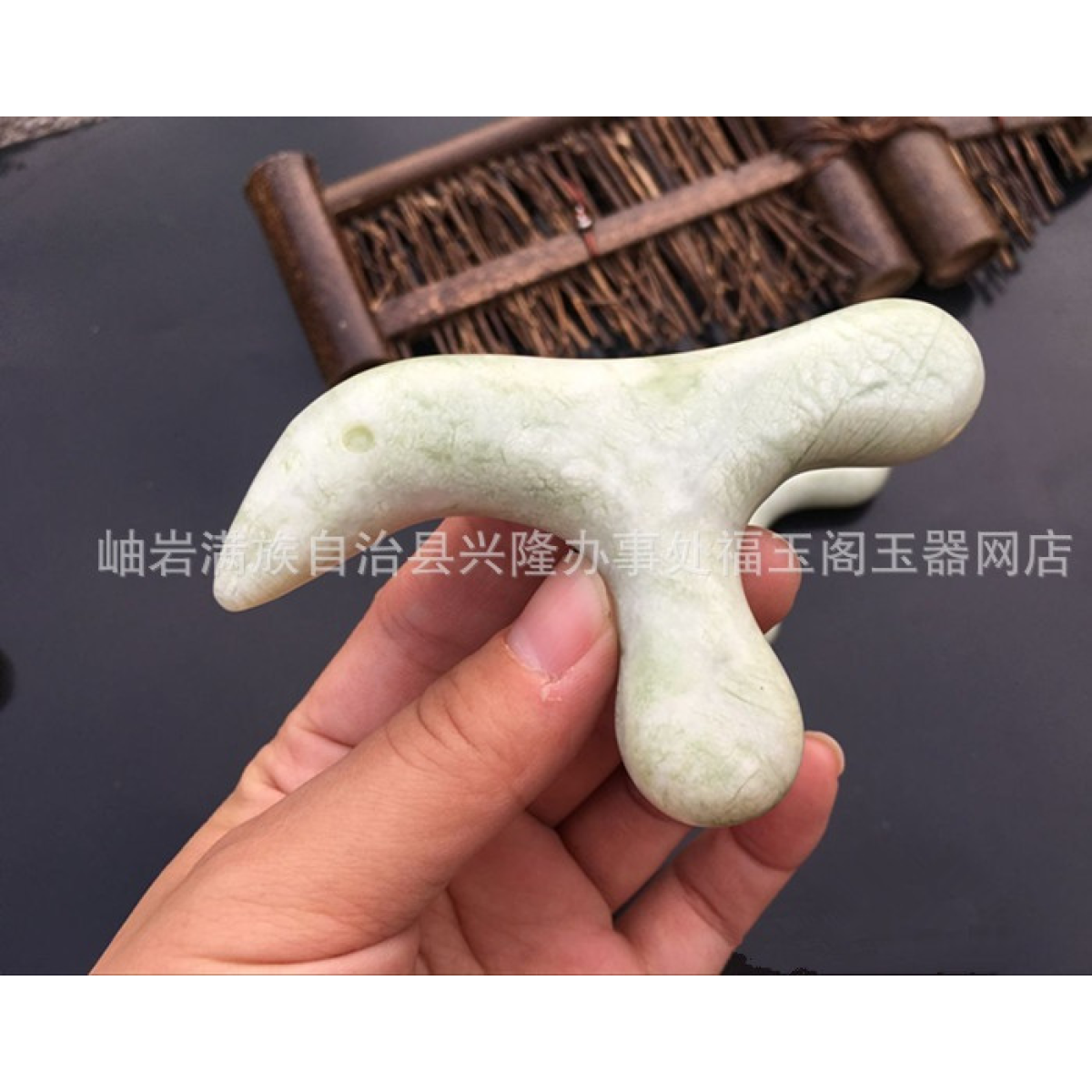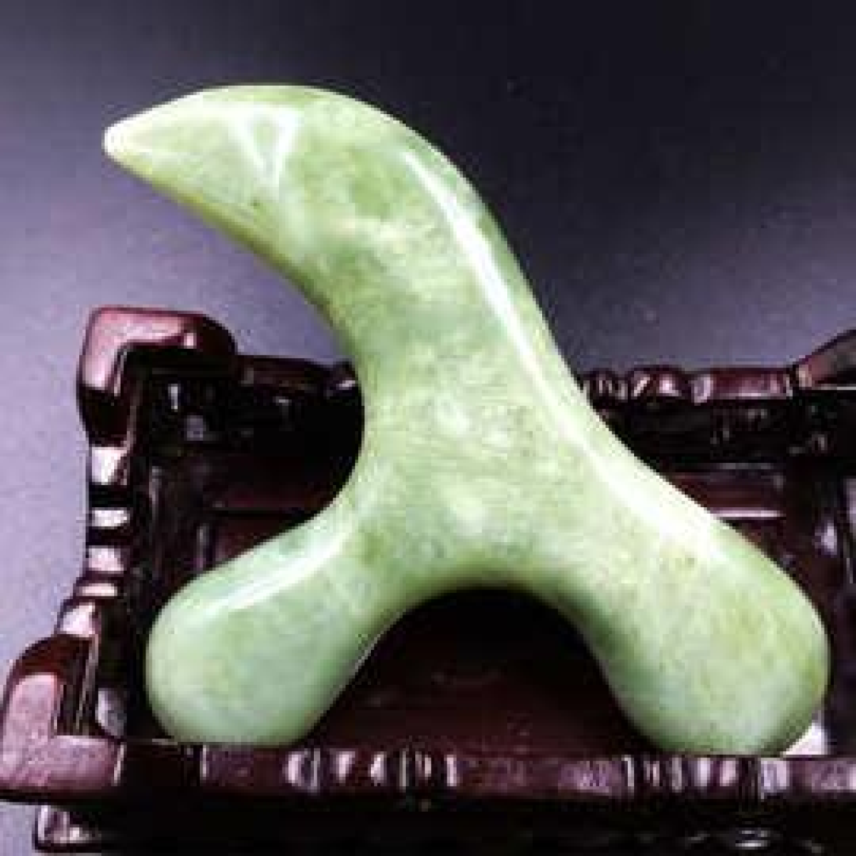 На зображенні представлений нефритовий масажний інструмент, призначений для акупунктури стоп або рефлексології. Інструмент має вигнуту форму з декількома виступами, що дає змогу використовувати його для впливу на різні точки стопи.