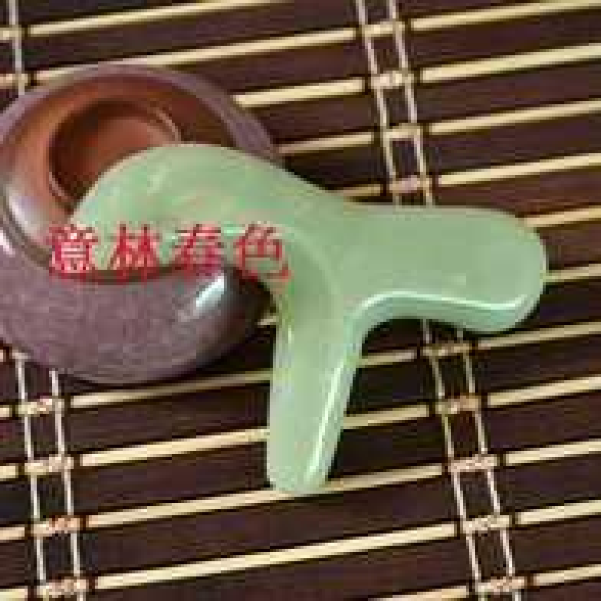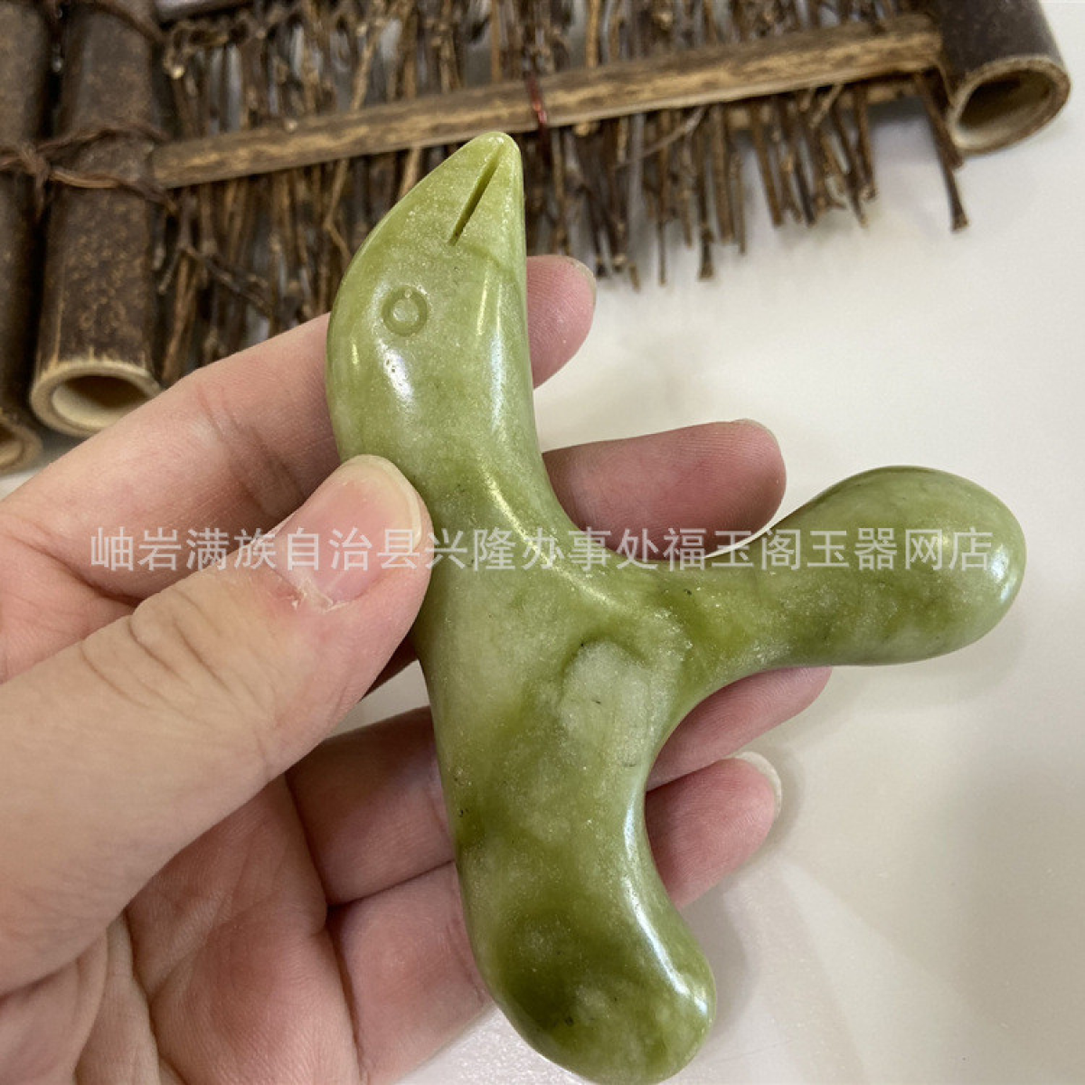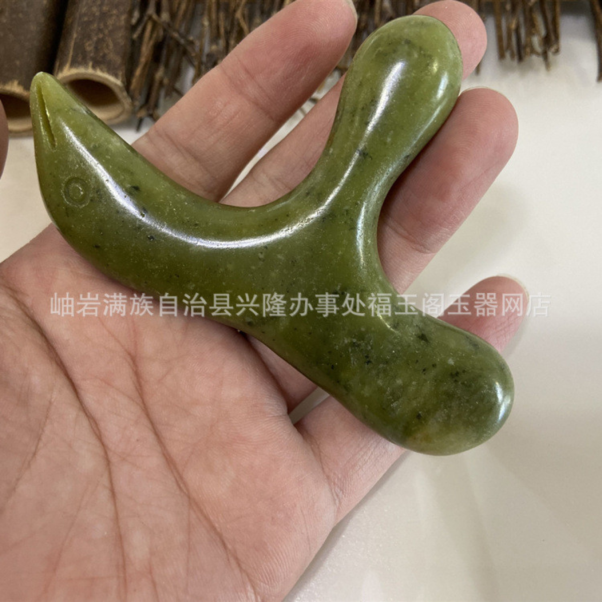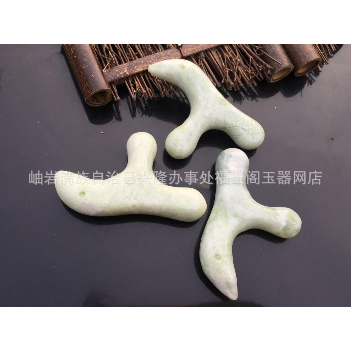 На зображенні представлений нефритовий масажний інструмент, призначений для акупунктури стоп або рефлексології. Інструмент має вигнуту форму з декількома виступами, що дає змогу використовувати його для впливу на різні точки стопи.