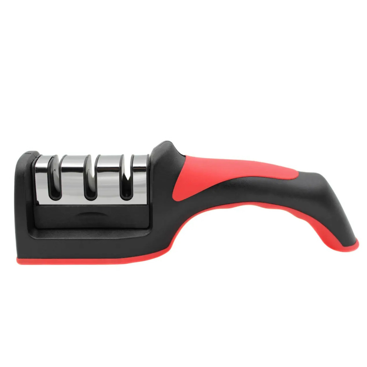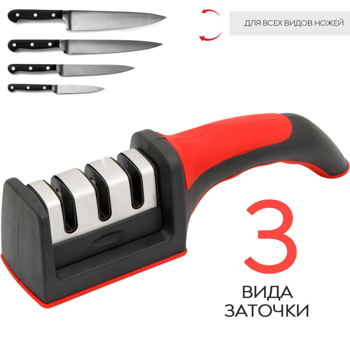 Конструкція інструмента для заточування ножів складається з пластикового корпусу, виготовленого з ABS-пластику, а також металевих різців. Корпус має зручну ергономічну ручку, нижня частина якої складається з прогумованих вставок, які не дадуть приладу ковзати поверхнею стола.
