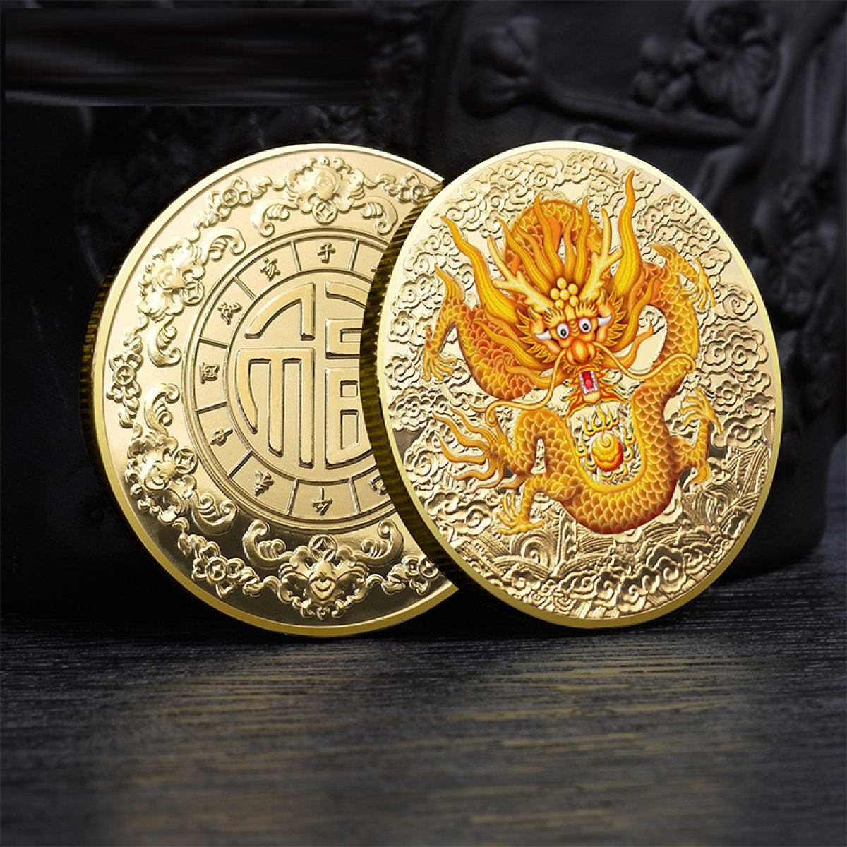 Пам“ятна кольорова монета на честь Року Дракона голд, рельєфні символи