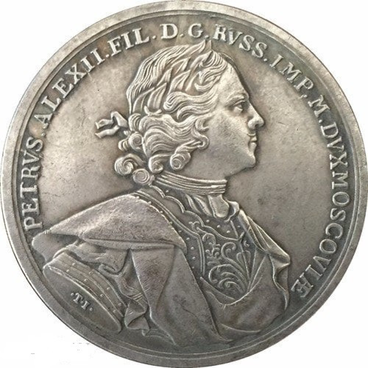 На лицьовій стороні погрудний портрет Петра I (M1) у доспехах, мантії та лавровому вінці вправо. В обрізі руки монограма медальєра: «М» («Мюллер»). По колу: «PETRVS ALEXIIFIL. DG RVSS. IMP. M. DVXMOSCOVIAE.» («Петр, Алексея син, божественною милістю Росії Повелитель, Великий рейх Московії»).