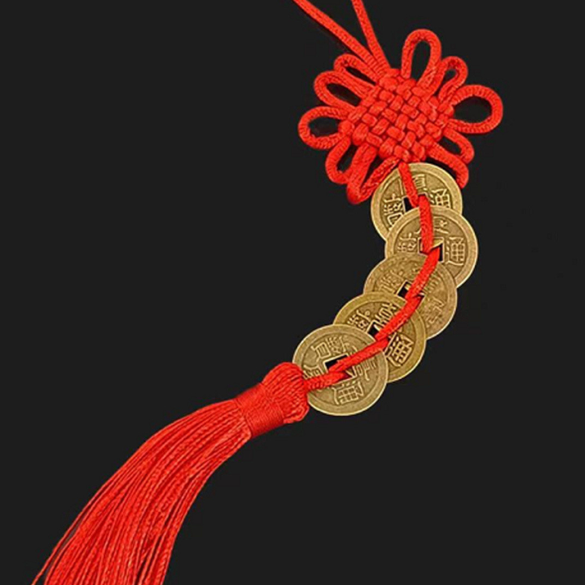 Зв“язка з п“яти монет із вузликом (червона нитка) для багатства та успіху 27 см
