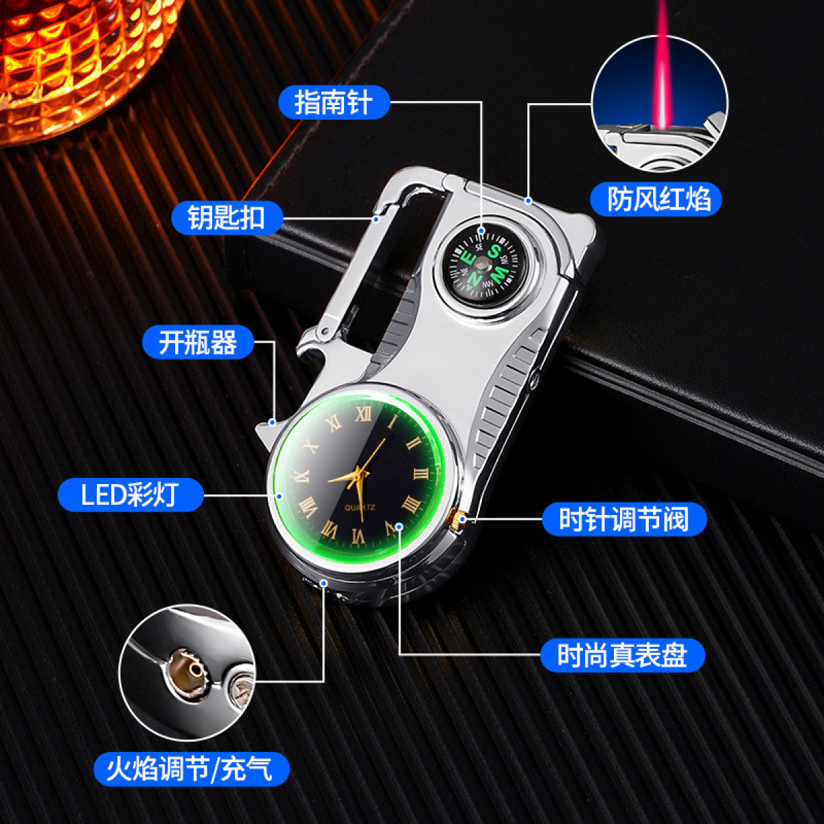 Ця універсальна запальничка 4-В-1 поєднує в собі вітрозахисну запальничку, компас, відкривачку для пляшок і брелок, що робить її незамінним супутником під час пригод на природі та повсякденного використання.