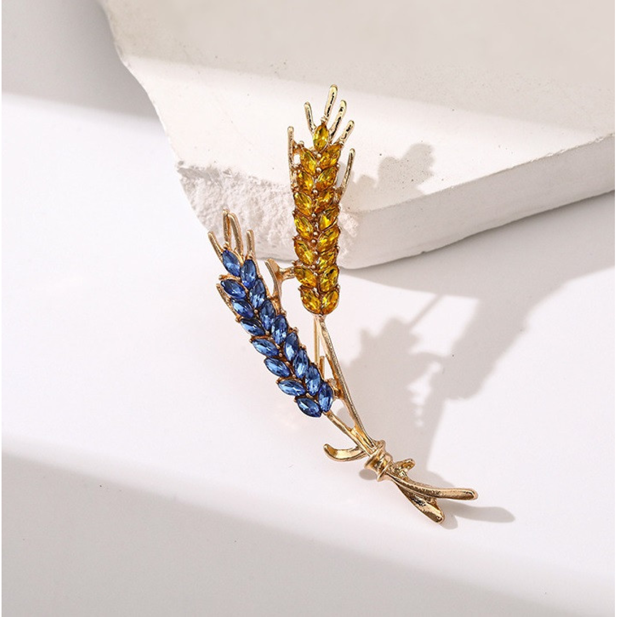 Ніжна брошка “Пшеничні колодки блакитного та жовтого“, для костюма, брошка шпилька на комірі