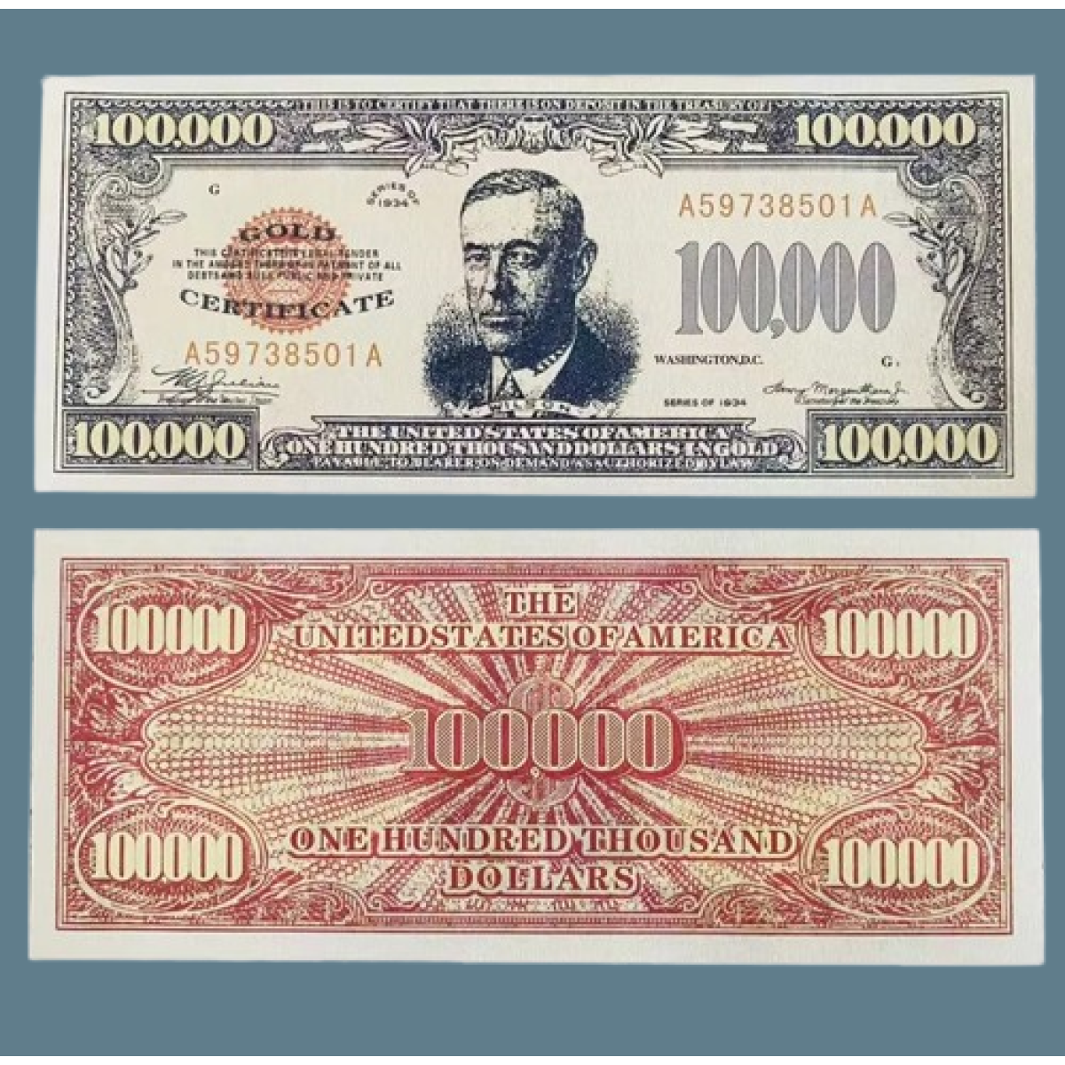 Банкноти США номіналом у 100 000 доларів США були випущені як «золоті сертифікати» в 1934 році (а не 1928 року, як ви вказали) під час Великої депресії для полегшення міжбанковських транзакцій, а не для поводження серед населення. На них був зображений портрет 28-го Президента США, Вудро Вудса. Реальна банкнота є рідкісним колекційним предметом, тоді як банкнота 1928 року випуску, найімовірніше, є сувенірною копією, зробленою на тонкому пластикі з покриттям, що імітує золото.