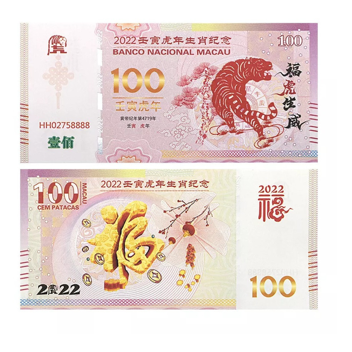 Видатні особливості: Сувенірна банкнота номіналом 100 патака Макао «Знак зодіаку Тигр» 2022 року. являє собою сувенірну банкноту, що не має номіналу в обігу. На додаток до захисної стрічки, банкнота також може світитися УФ-випромінюванням під фіолетовим світлом, відкриваючи унікальні та цікаві підводні світні зображення.