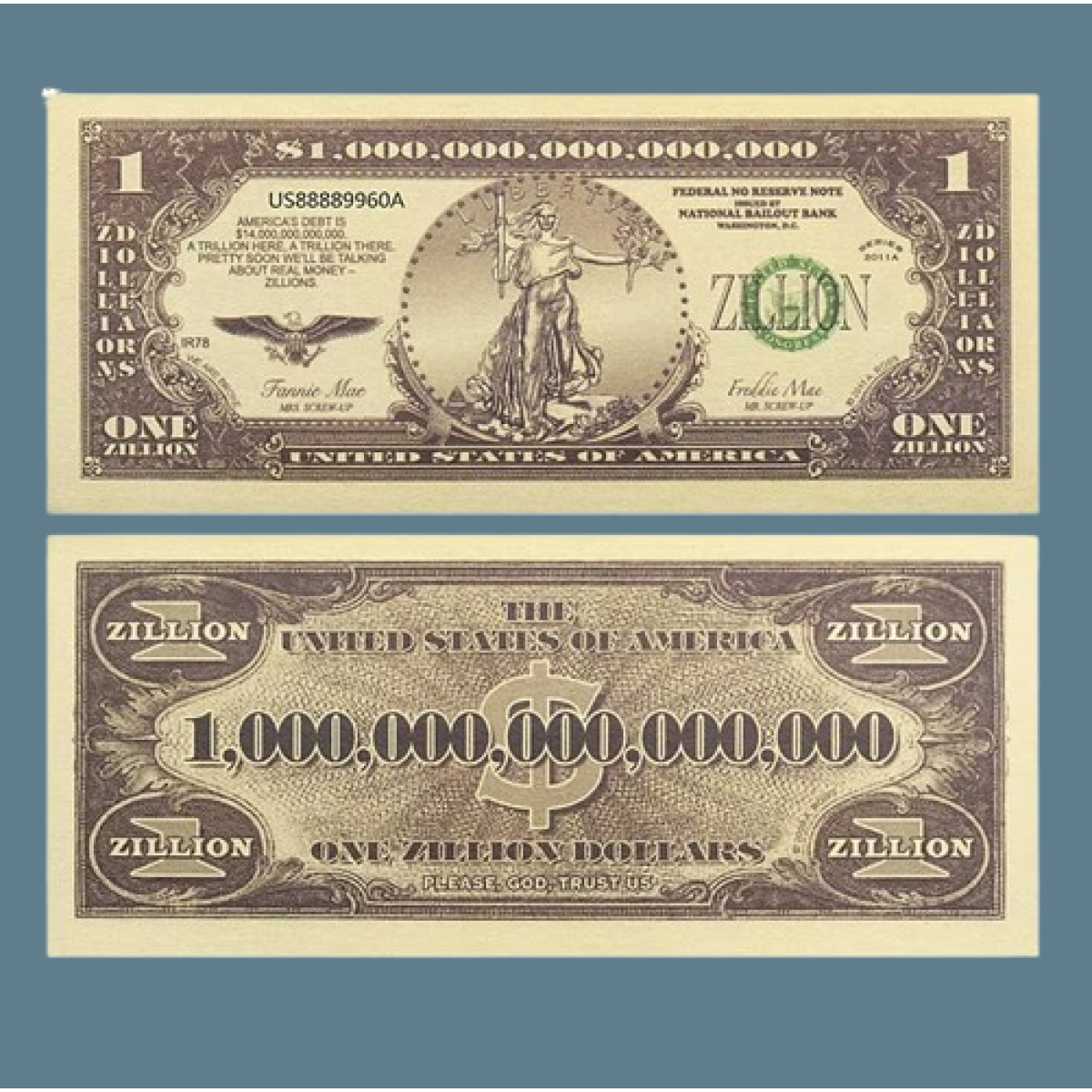 Опис продукту: Сувенір вартістю 1 Zillion доларів США — це сувенірна купюра, що не має реальної цінності. На лицьовій стороні цієї сувенірної купюри міститься цифра 1 Trillion доларів США, зображення американського орла, статуї свободи та слова «Поєднані Штати Америки Trillion ». На зворотному боці надрукована цифра 1 000 000 доларів США, зображення будівлі Національного збору та слова «Один мільйон доларів».