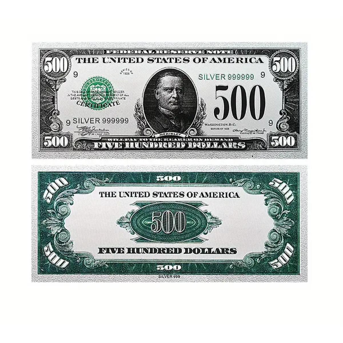 Банкнота 500 доларів 1928 року є рідкісним екземпляром, на лицьовій стороні якого зображений портрет 25-го президента США Вільяма Мак-Кінлі, а на зворотній — офіційна резиденція президента, Білий дім. Це банкнота типу “золотий сертифікат“, яка грала важливу роль у великих транзакціях і міжбанковських розрахунках у період до широкого поширення електронних платежів.