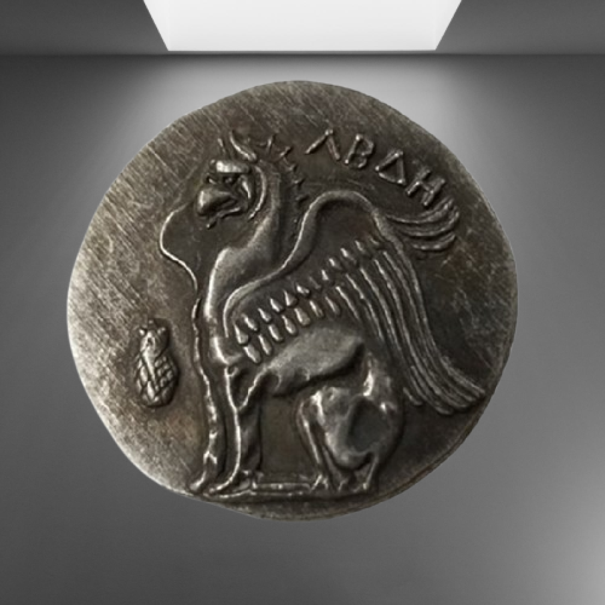 Статер, ок. 362 г. до н. е. (срібло, 13,07 г, 24 мм). ÷ Грифон сидить ліворуч, його крила злегка розправлені; ліворуч зверху видно цикаду / ÷| | | (після три букви ретроградні) Геракл сидить напівобірнувшись вліво на скелі, покритій левовою шкурою, його тулуб злегка розгорнутий, а голова частково розвернута, а голова частково повернута вправо; тримає шпильку, що спирається на праве коліно правою рукою, а ліву руку поклали на ліве стегно; все всередині неглибокого вдавленого квадрата. AMNG 105. Період Хрисантхакі VI, стор. 122-123. Трава 393/396 (аверс A 276/реверс P 322). SNG Lockett 1132. Traité IV, 1379 і табл. CCCXXXVI, 12.