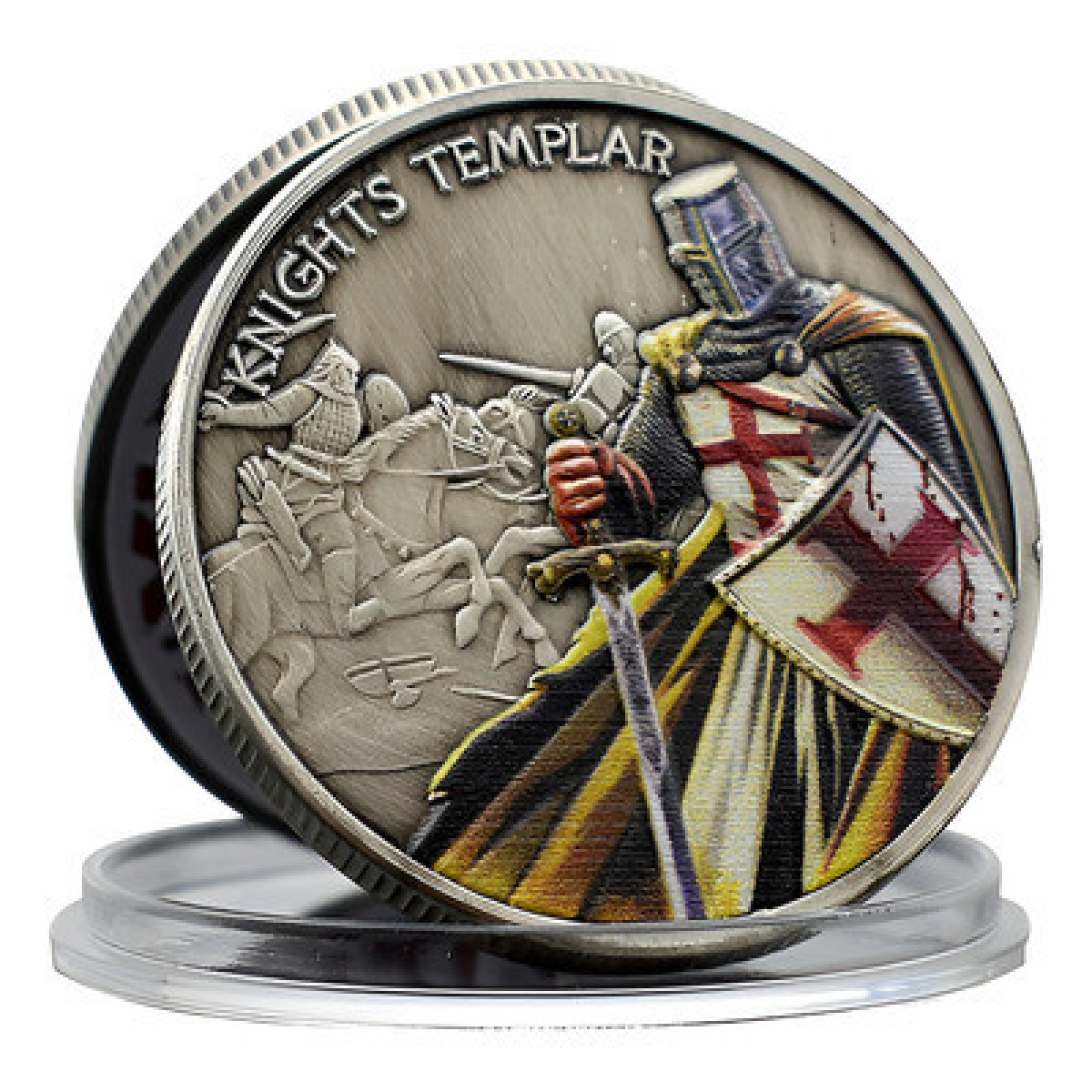 На зворотному боці монети тамплієрів вигравіювані два лицарі на коні та латинський напис: «SIGILLUM MILITUM XPISTI».