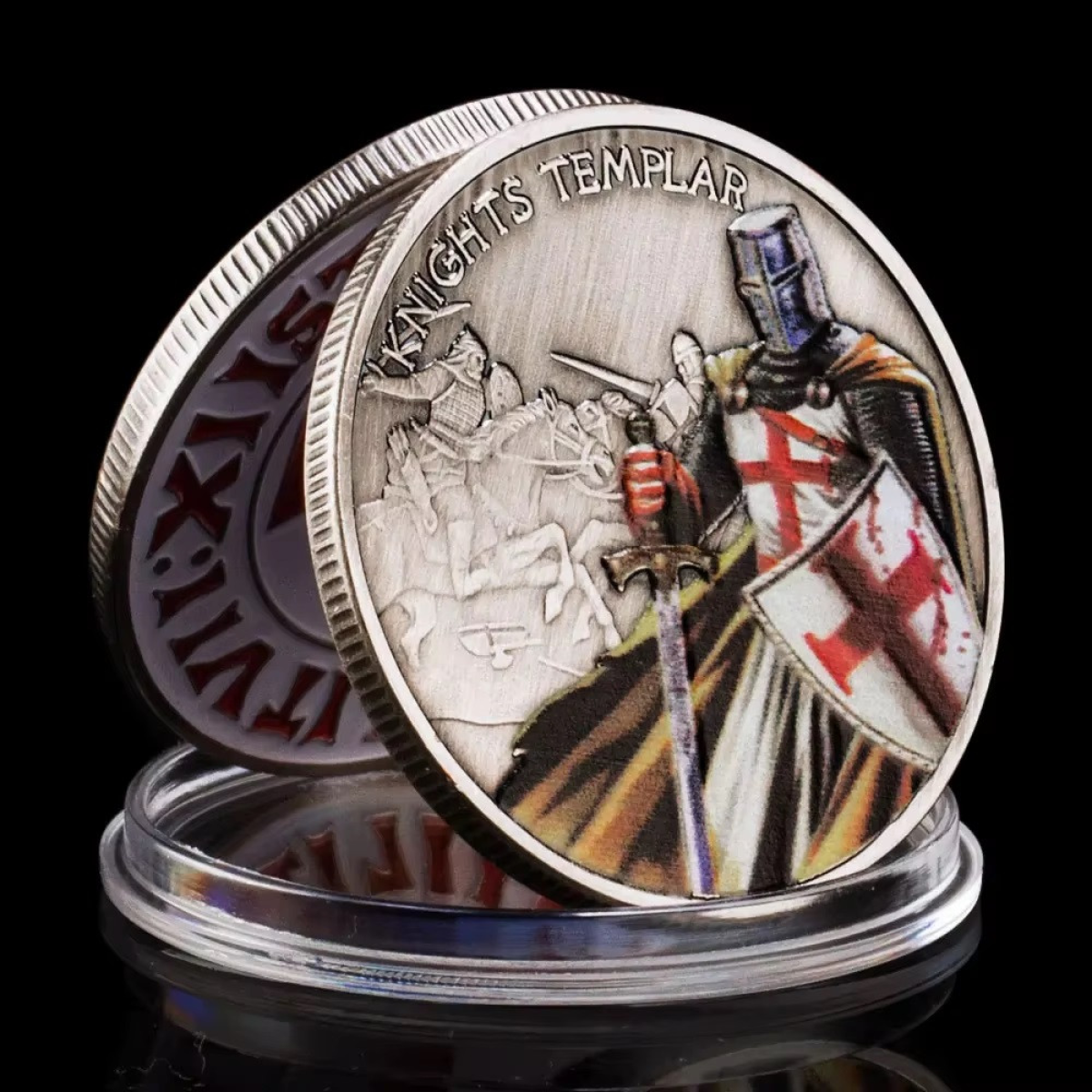 На зворотному боці монети тамплієрів вигравіювані два лицарі на коні та латинський напис: «SIGILLUM MILITUM XPISTI».