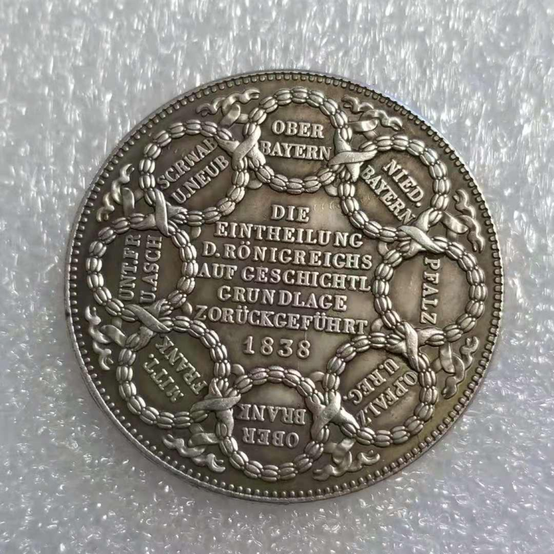 Талер 1838 року “На честь повернення районум Баварії їхньої історичних назв“ (Баварія, Людвіг I)