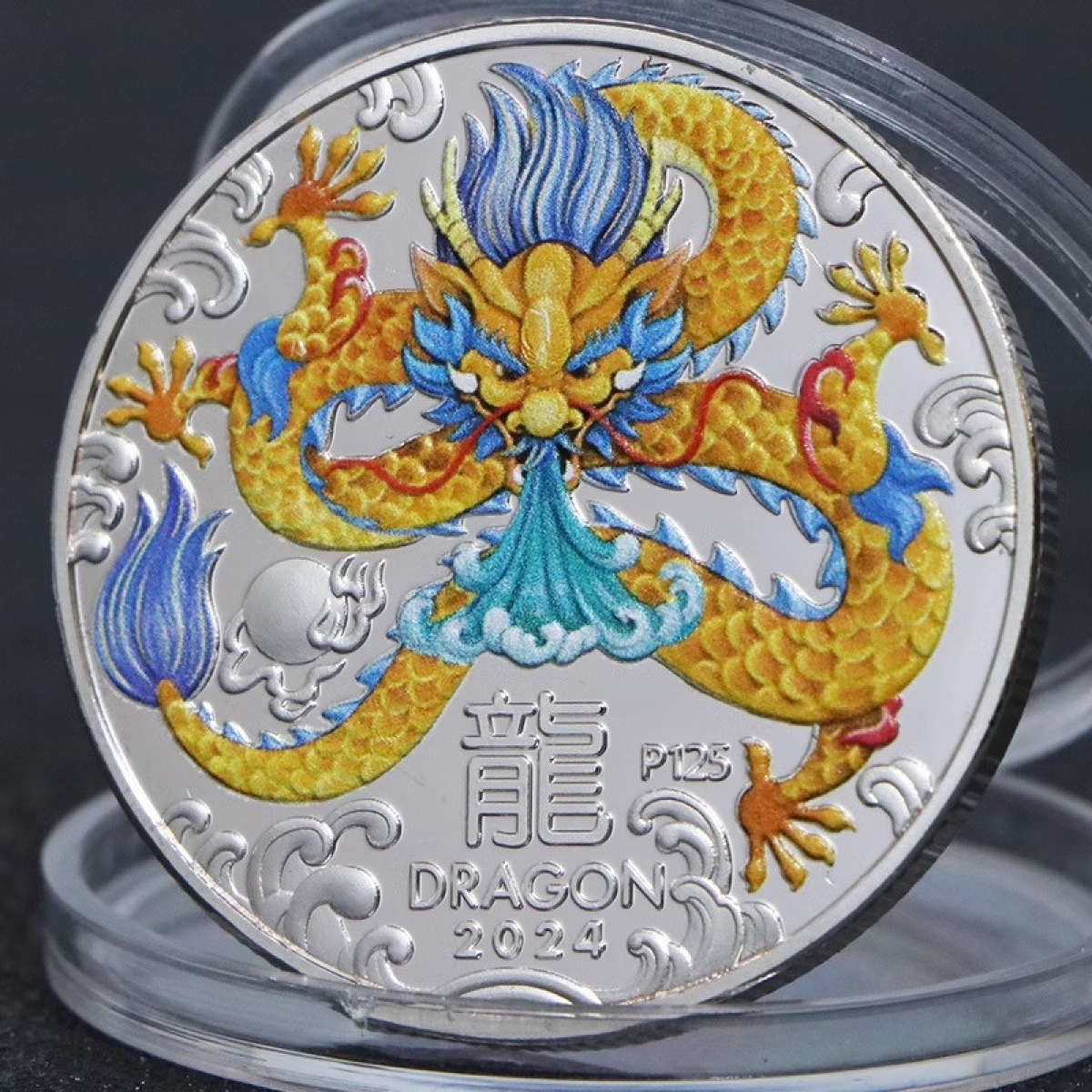На реверсі монети зображений приголомшливий дизайн: дракон, що летить, символ мудрості. У дизайн також входять китайський канап «Дракон», напис «DRAGON 2024»