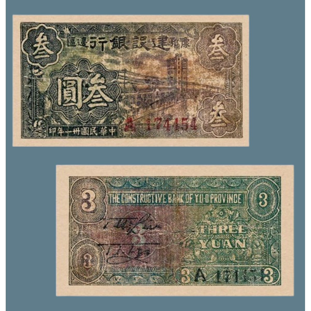 Сувенір банкнота заєм 3 юані 1942 року, Банк будівництва кордону Хенань-Хубей. Китай