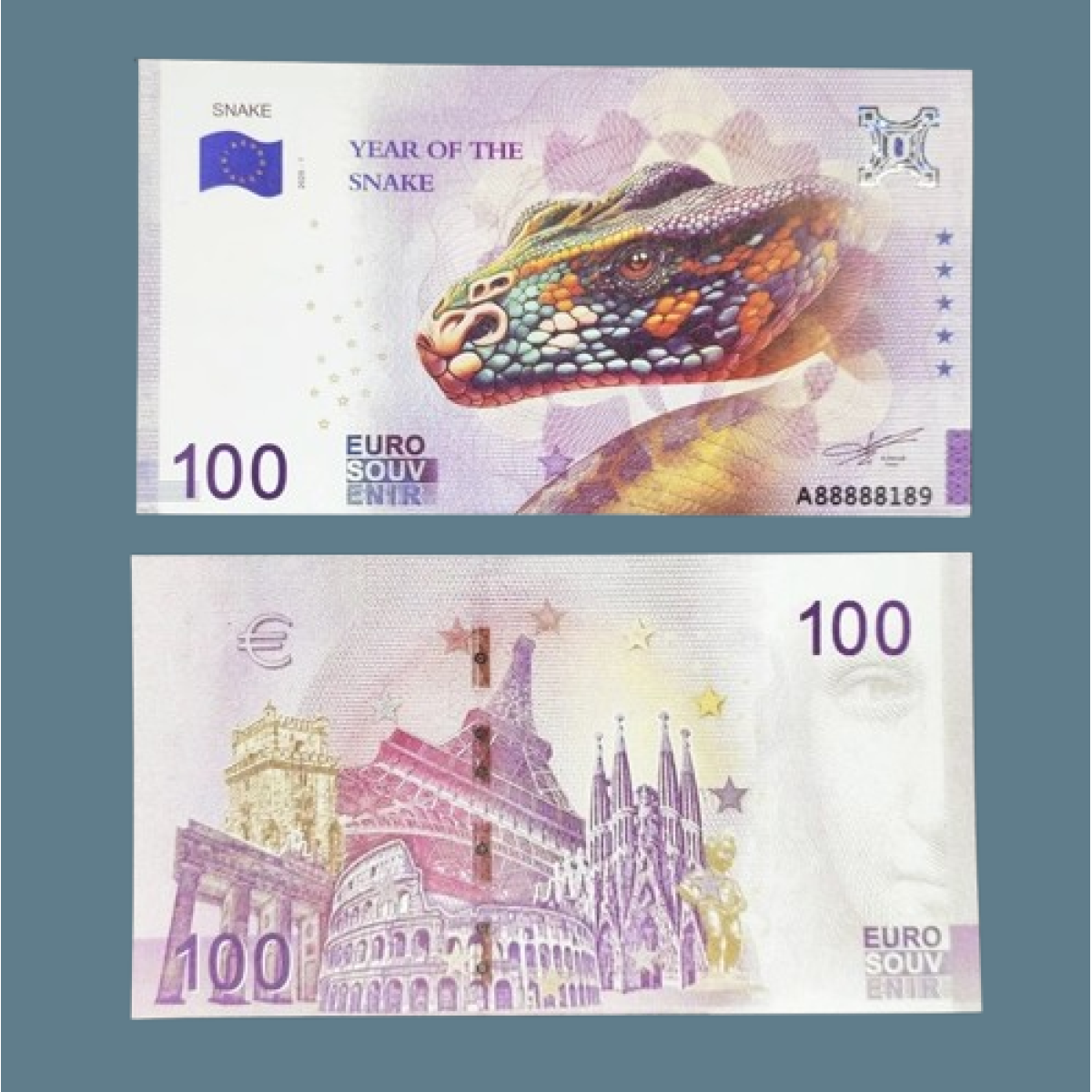Всі сувенірні євробанкноти, виготовлені у фіолетовому кольорі, схожі на банкноти номіналом 500 євро та мають розмір банкноти номіналом 20 євро.