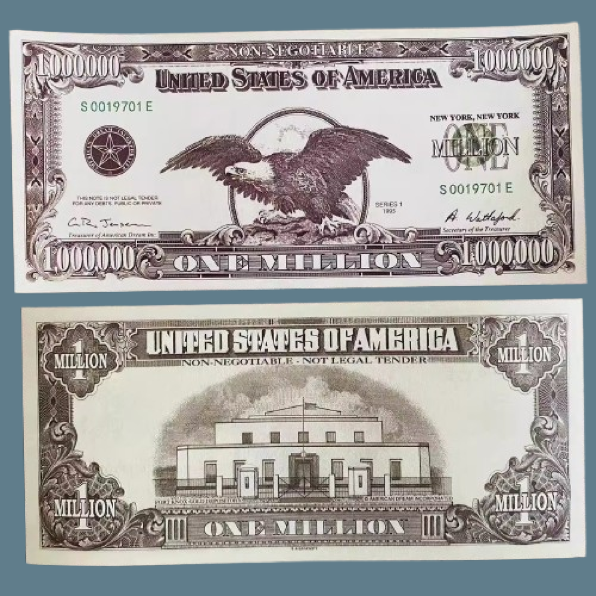 Видатні особливості: Сувенірна банкнота «Світний орел» номіналом 1 мільйон доларів США — це сувенірна банкнота, що не має номінальної вартості в обігу. На додаток до тисненої поверхні банкноти того ж кольору, що й купюра долара США, що має щасливе значення, банкнота також може світитися УФ-випромінюванням під фіолетовим світлом, відкриваючи унікальні та цікаві підводні світні зображення. Підходить для колекціонування та подарунків родичам і друзям.