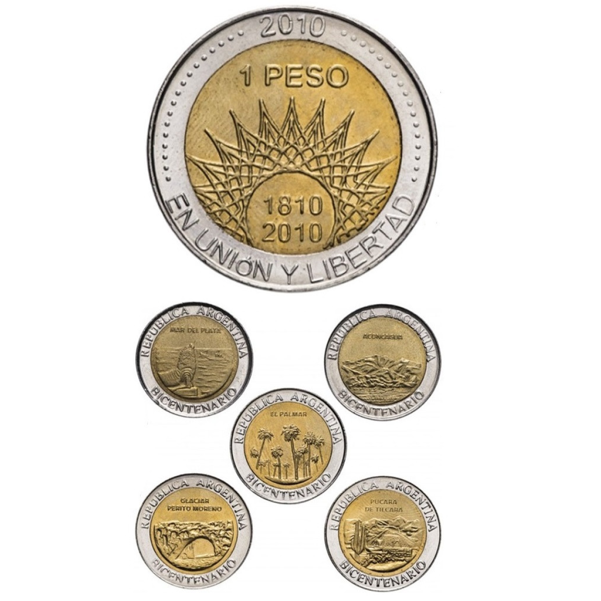Ювілейні монети Аргентини. Набір із 5 монет — 200 років Аргентині — парк Ель-Пальмар, вулкан Аконкагуа, місто Мар-дель-Плата, Спирці міцності Пукара біля міста Тилькара, льодовик Періто-Морено.