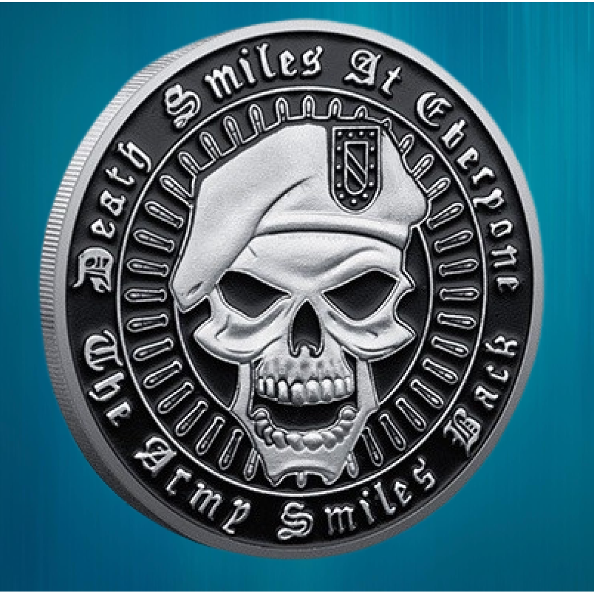 «Смерти усміхається всім... Зелені берети усміхаються у відповідь» — гнеться на цій грізній срібній монеті-зводі. На лицьовій стороні монети зображений 3D-череп у бойовому спорядженні, а з боків із кулями на сріблясто-чорному тлі. Зворотний бік монети сріблясто-зелена та зображує Орла, усміхніться смерті в обличчя з цією деталізованою монетою-дзвінком!