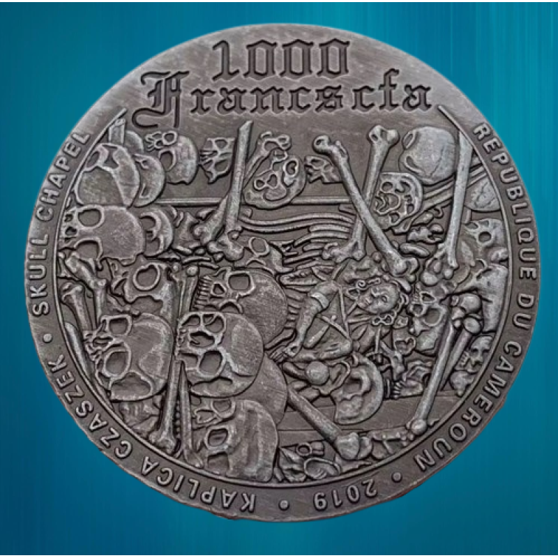 На реверсі монети зображена часнику Черепа. На аверсі монети інший різновид годинника та написів: “1000 Francs cfa“ — номінал, “REPUBLIQUE DU CAMEROUN“ — країна-емітент, “2019“ — рік випуску, “KAPLICA CZASZEK“ назва годинника на польській мові та “SKUL CHEL“ — назва монети.
