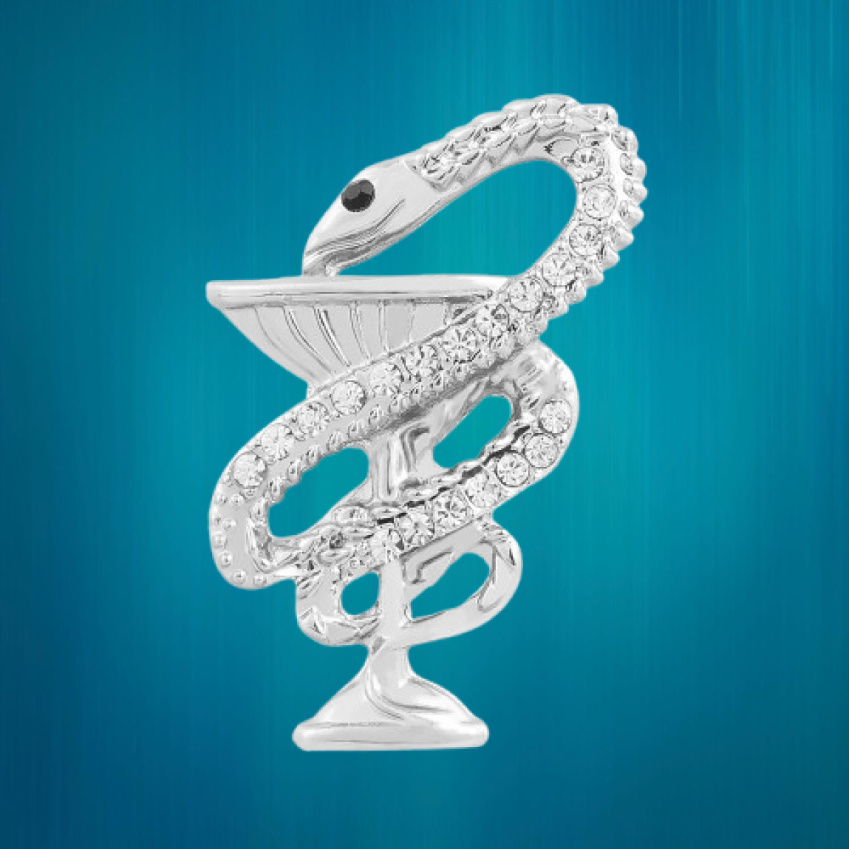 Брошка, значок мідіку “Чаша зі змійкою“ 3.5х2.5мм, стрази сильвер, піни, біжутерія медична