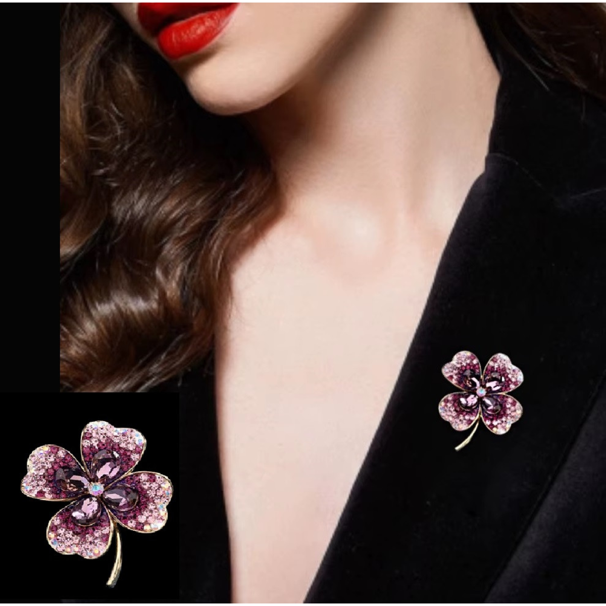 Ніжна броша квітка “Клевер фіолет кристали та стрази“ 4,5х5 см, для жінок, для костюма, шпилька на комірі