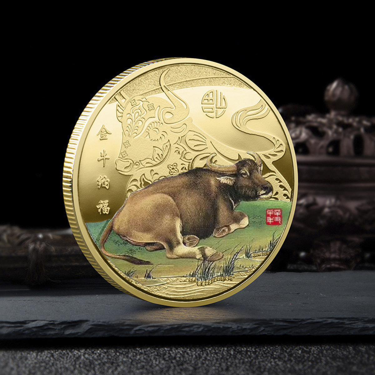 Сувенірна Китайська пам“ятна кольорова монета 2021 року, колекційні монети «Год Бика» Голд