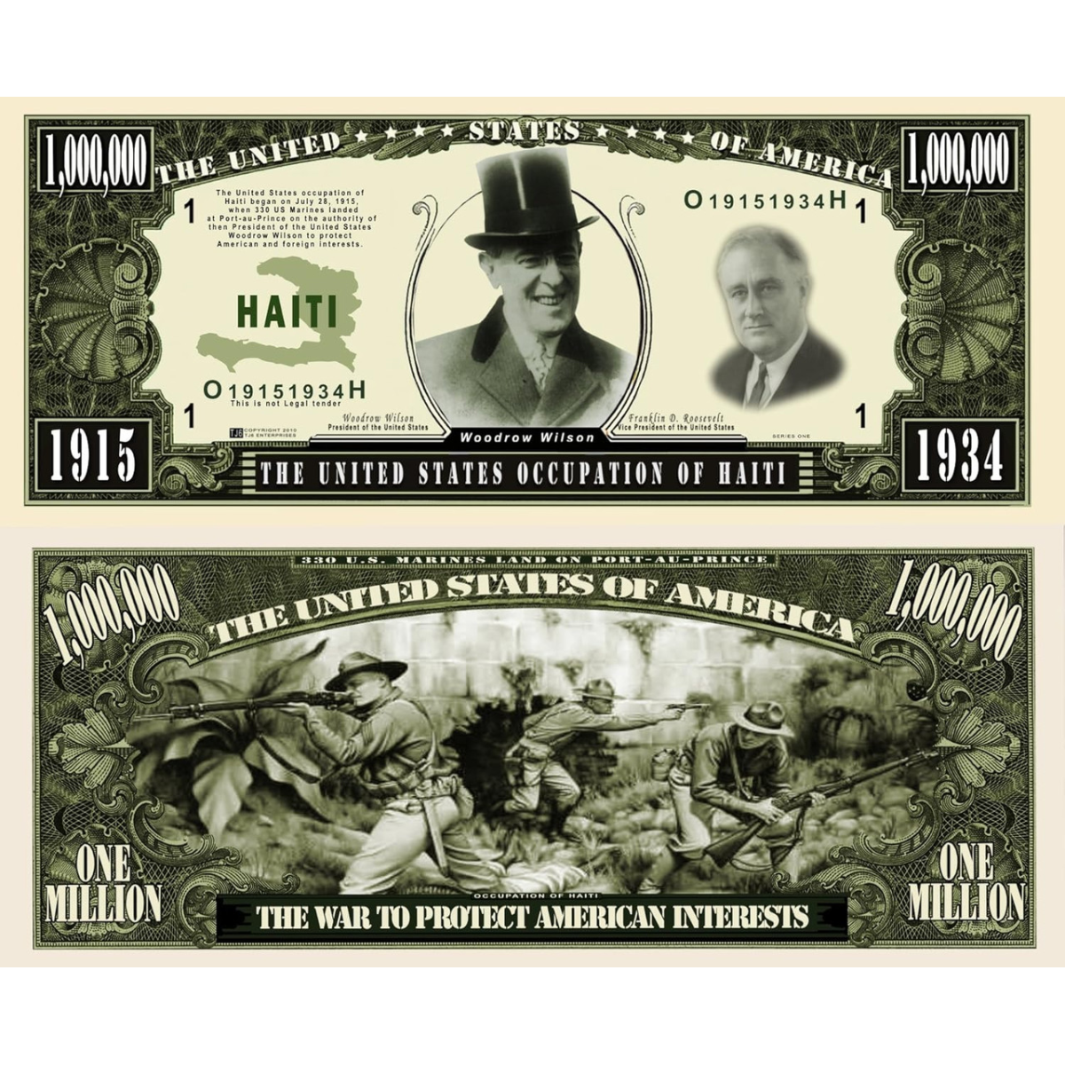 Зображення являє собою сувенірну банкноту, присвячену COBEC“єднаними Штатами Америки. На верхній частині банкноти зображені Вудро Вудро Морріс і Франклін Дело Рузвельт, а також вказані дати “1915“ і “1934“, що позначають період косметання. Напис каже: “Окупація Гаїті З“єднаними Штатами“. На нижній частині банкноти зображена сцена, що символізує “Війну за захист американських інтересів“, з написом “Один мільйон“.