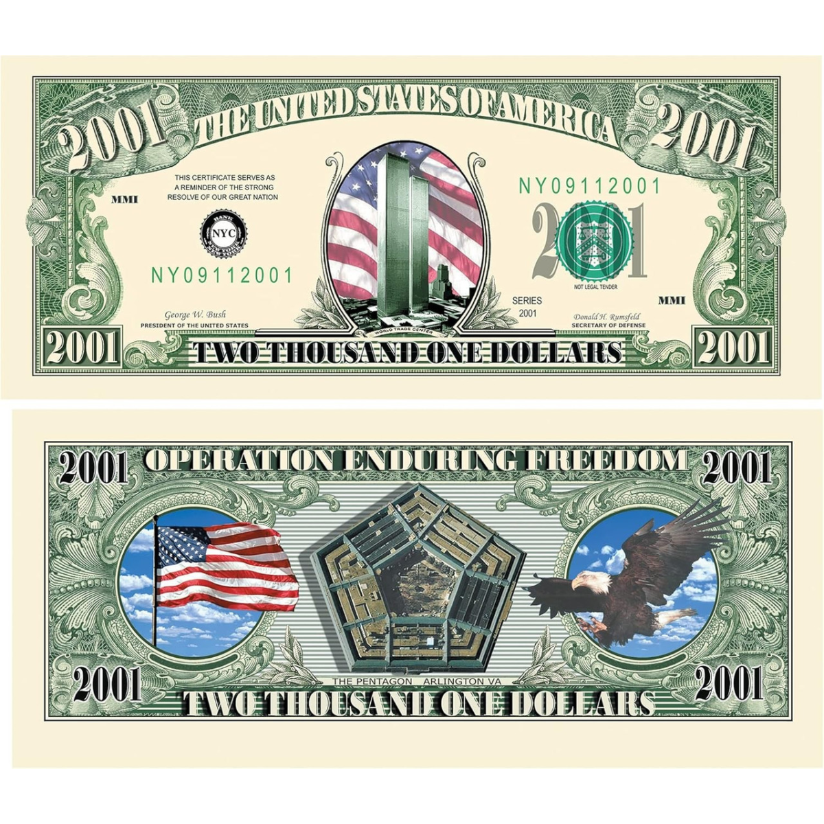 Знак на зображених грошима, а саме зображення Всесвітнього торгового центру (башн-близнюків), Пентагона й орла, означає, що — це пам“ятна купюра, випущена на честь подій 2001 року, зокрема й Maren 11 вересня та подальшої операції “Незламна свобода“.