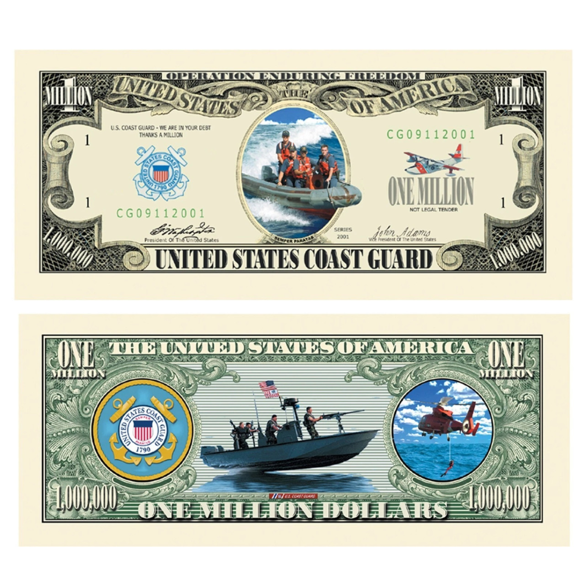 Містить написи “ONE MILLION DOLLARS“, “THE UNITED STATES OF AMERICA“, емблеме Берегової охорони, а також зображення патрульного катера та рятувального гелікоптера.