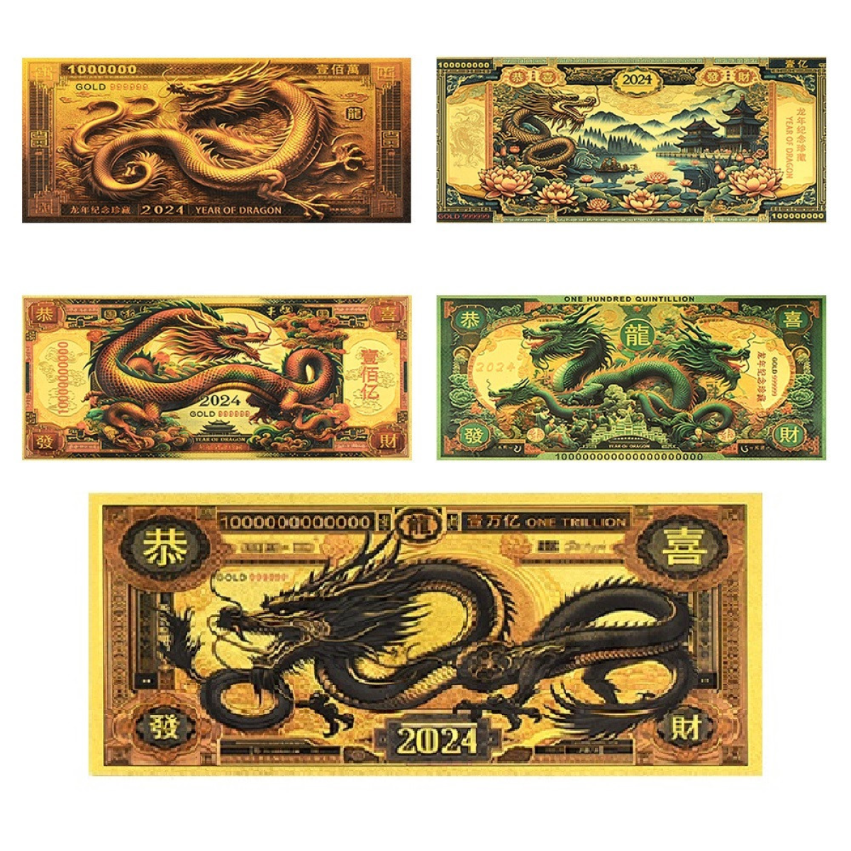 Золоті колекційні банкноти рік Дракона 2024-5 шт. (золота фольга)