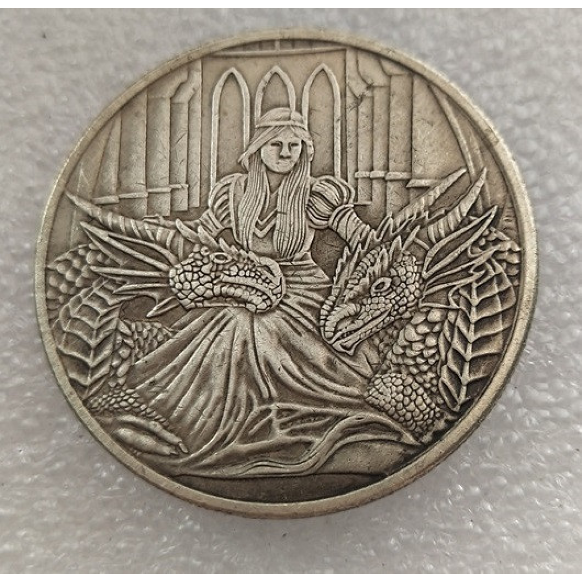 На лицьовій стороні цієї приголомшливої монети зображені два дракони, які сидять на землі, поклавши голови на коліна прекрасної жінки в довгому середньовічному платті. Вона ніжно кладе руку їм на голови. Витончені колони й арки на задньому плані надають дизайну королівський шик.