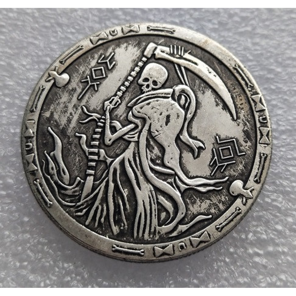На зображенні представлена монета або медальйон із зображенням Смерті, що тримає косу.