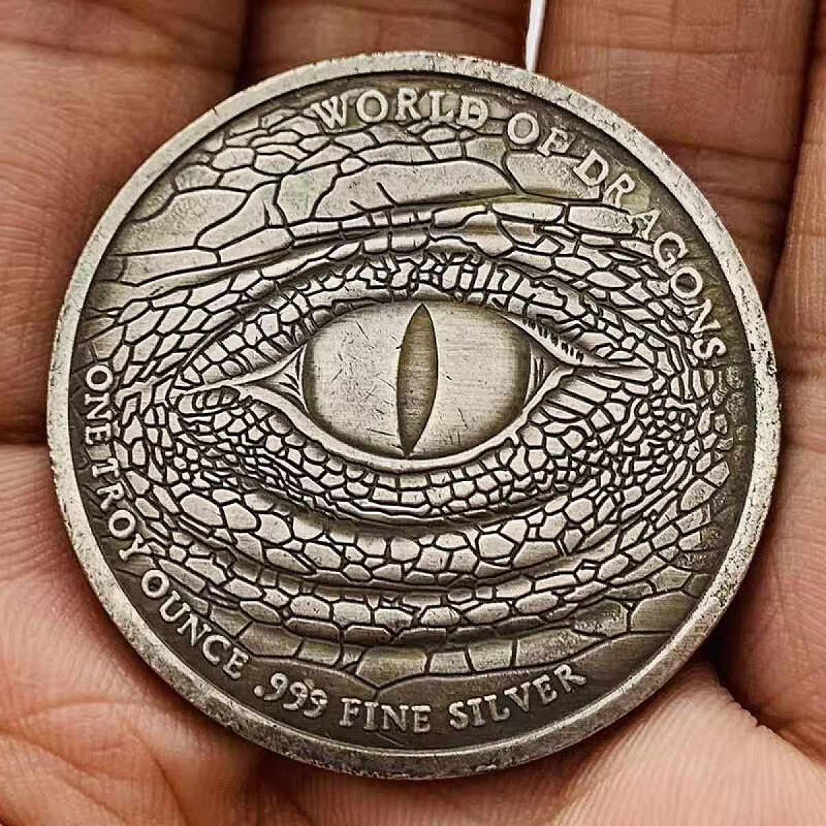 На аверсі монети зображене детальне око дракона, оточене лускатою текстурою, що імітує шкіру рептилії.