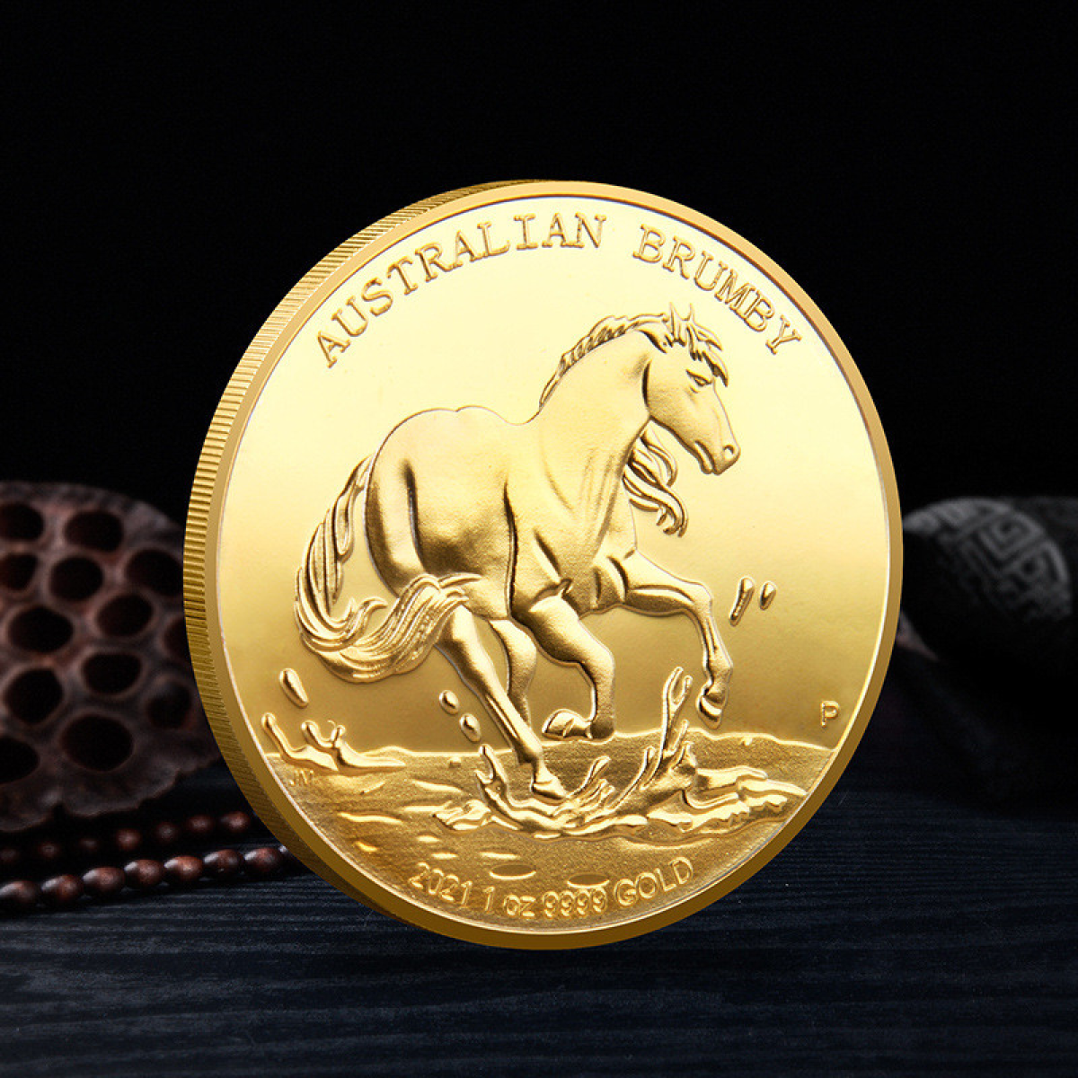 На реверсі відчеплене зображення скачучого Брамбі (дикою австралійського коня) серед характерних для Снігових гір і Вікторіанських Альп скелястих оголень. Вгорі напівкругом розміщений напис “AUSTRALIAN BRUMBY“, а внизу — “2021 1oz 9999 SILVER“. Справа міститься знак Пертського монетного двору — “P“.