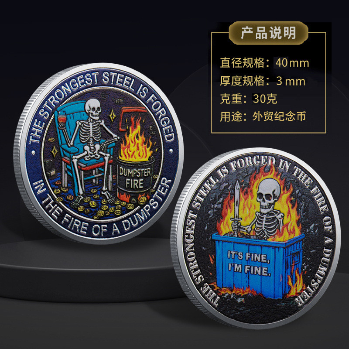 На монеті зображений сміттєвий контейнер (dumpster) у вогні, що є гумористичною метафорою хаотичної або фатальної ситуації.