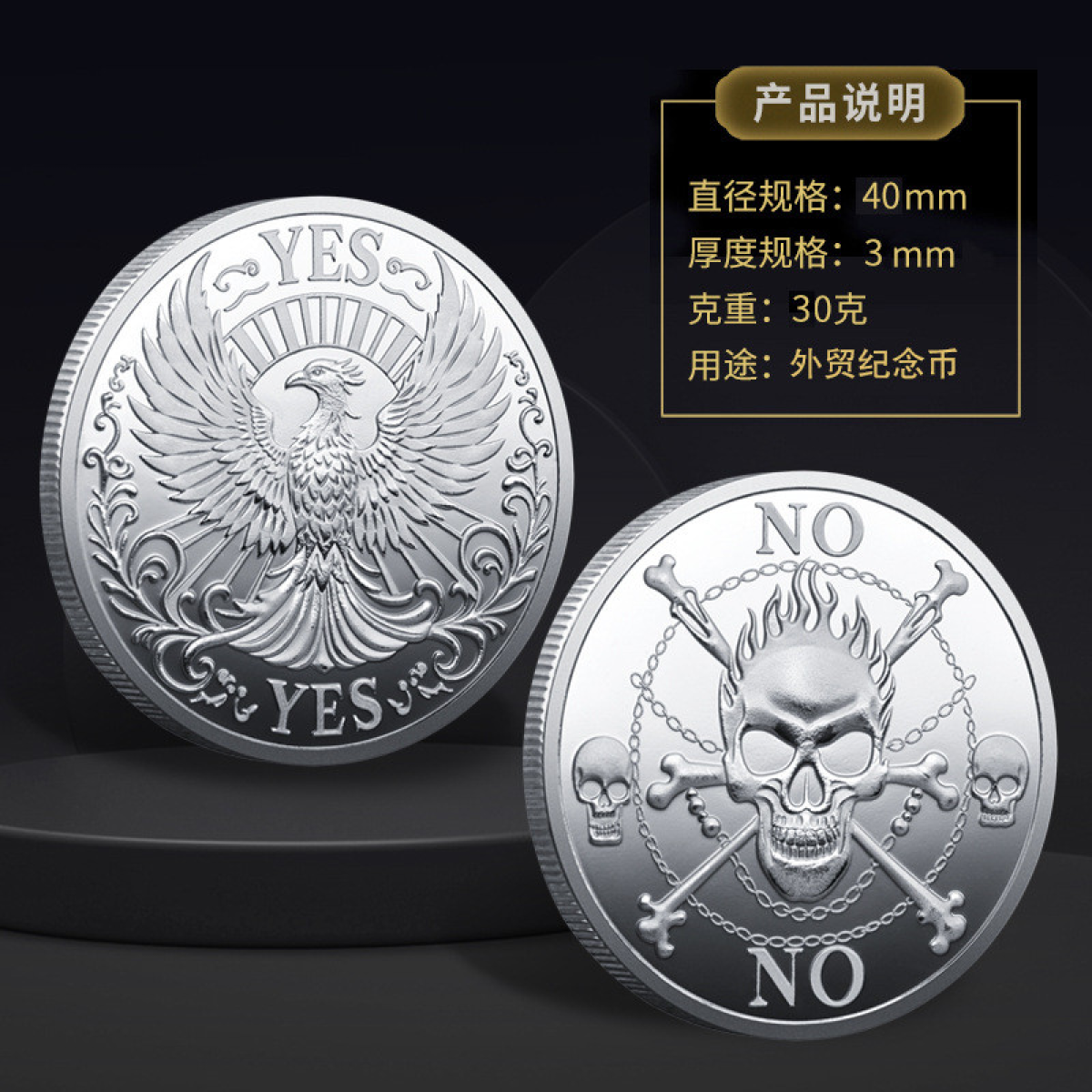 На одній стороні зображений фенікс із розправленими крилами, оточений декоративними елементами. У верхній і нижній частині монети вигравіюване слово “YES“ (Так).