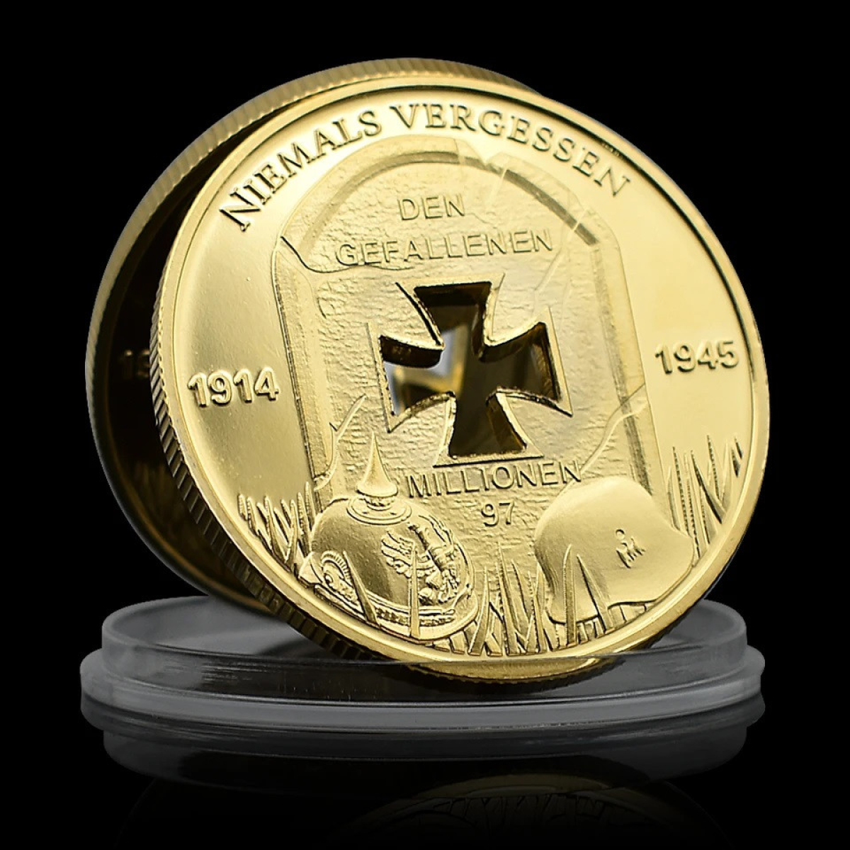 Монета на зображенні являє собою позолочену сувенірну монету, присвячену Другій світовій війні та пам“яті опалих солдатів.