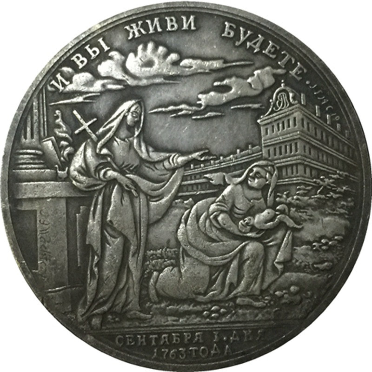 Являє собою композицію, що містить будівлю виховательного будинку праворуч і дві жіночі фігури на передньому плані. Ліва фігура, зображена в повний зріст із хрестом на правому плечі, символізує Веру. Вона закликає колінопреклону діву, готову розлучитися зі своїм немовлям. У верхній частині медалі розміщений напис: “І ВИ ЖЕВІ БУДЕТЕ“, а внизу — “СЕНТЯБРЯ 1 ДНЯ = 1763 роки“.