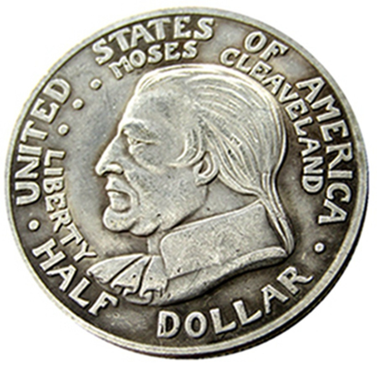 Аверс (лицьова сторона): Обладнаний профіль Мозеса Колвінсера, засновника міставича. По окружности надписи: “UNITED STATES OF AMERICA“, “LIBERTY“, “MOSES CLEAVELAND“ и “HALF DOLLAR“.