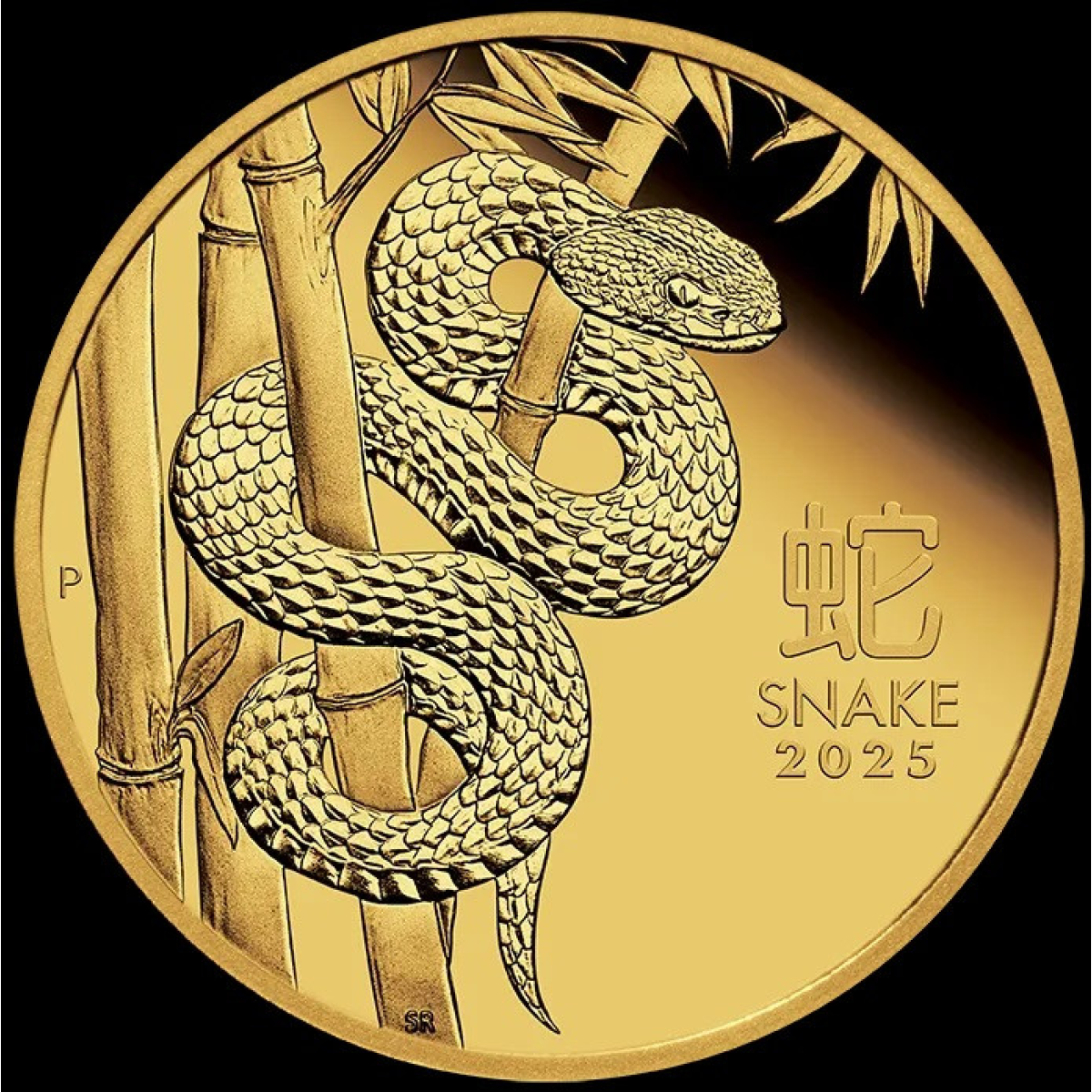 На реверсі монети зображена змія, що обвивається між бамбуковими стеблами. У дизайні є китайський кантаз «змія» та напис «SNAKE 2025».