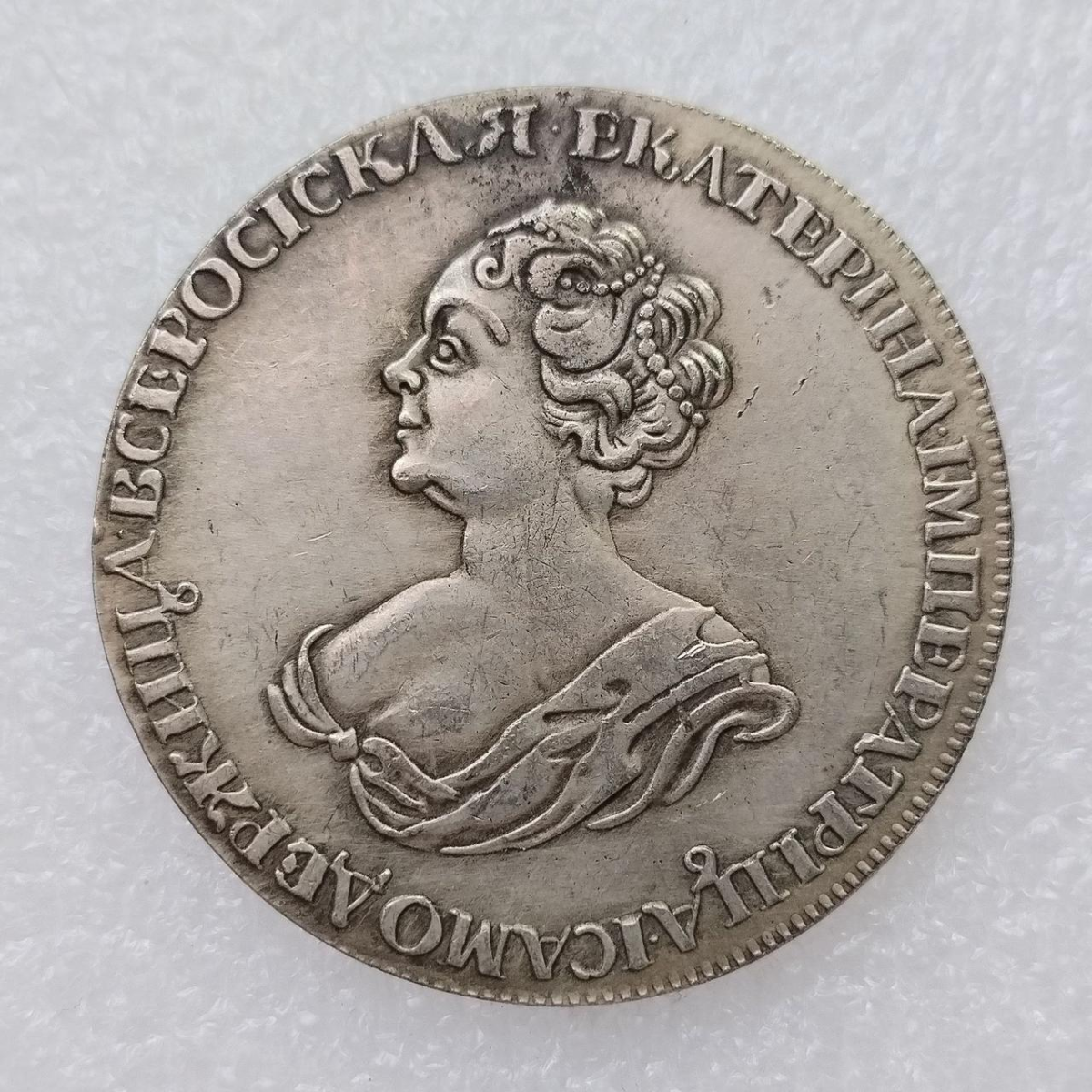 Монета на зображенні — це срібний рубль 1725 року з портретом імператриці Катерини I.