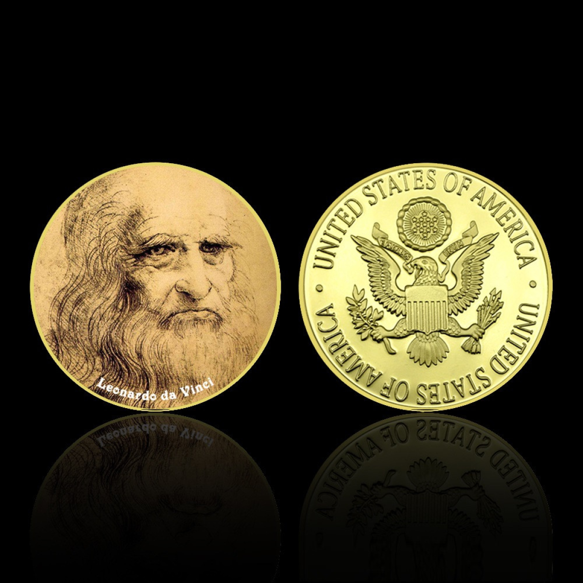 На зображенні представлені круглі сувенірні монети, на яких зображені відомі твори мистецтва та портрети, пов“язані з Леонардо так Вінчі. Серед них можна побачити: