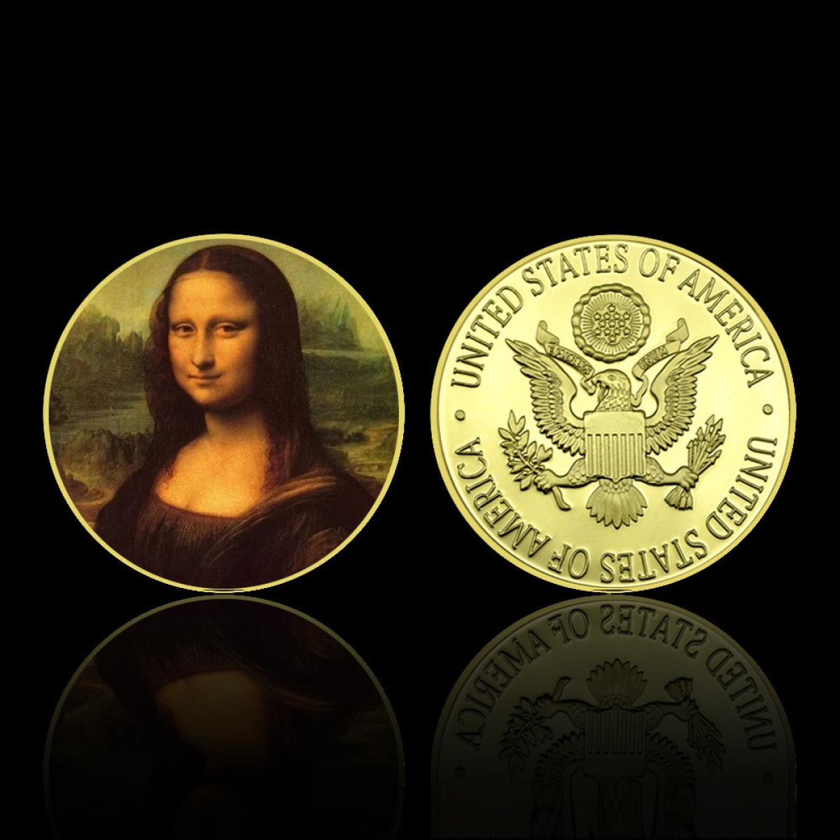 На зображенні представлені круглі сувенірні монети, на яких зображені відомі твори мистецтва та портрети, пов“язані з Леонардо так Вінчі. Серед них можна побачити: