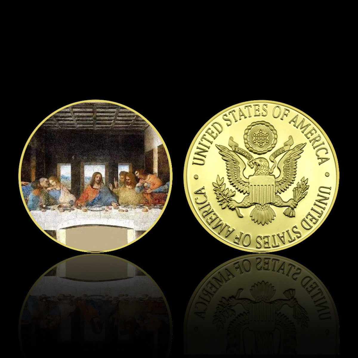 На зображенні представлені круглі сувенірні монети, на яких зображені відомі твори мистецтва та портрети, пов“язані з Леонардо так Вінчі. Серед них можна побачити: