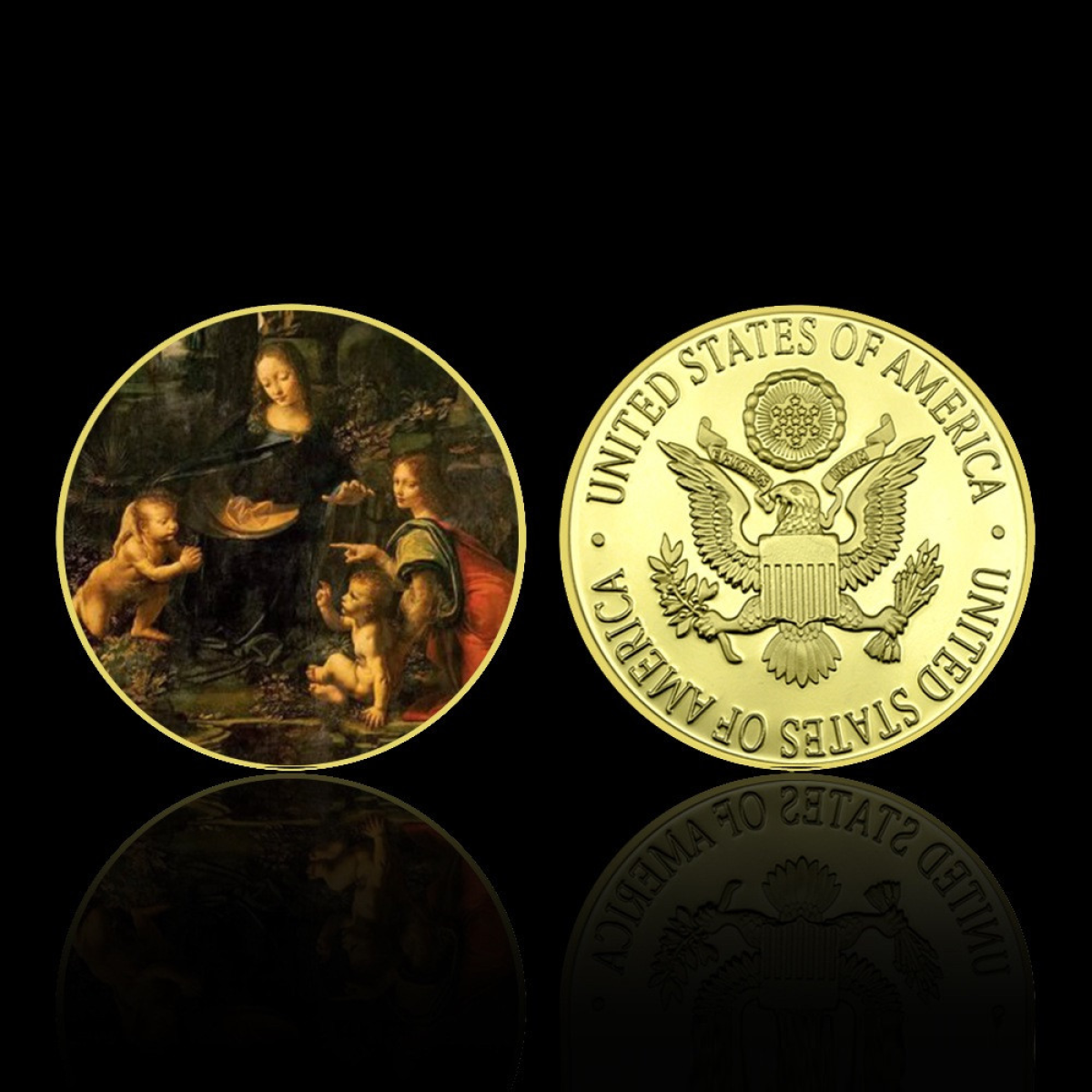 На зображенні представлені круглі сувенірні монети, на яких зображені відомі твори мистецтва та портрети, пов“язані з Леонардо так Вінчі. Серед них можна побачити: