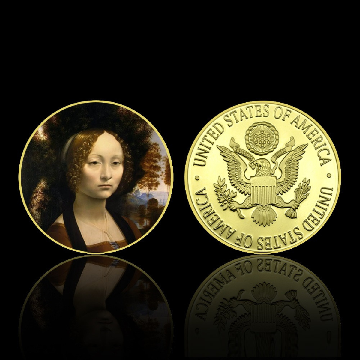 На зображенні представлені круглі сувенірні монети, на яких зображені відомі твори мистецтва та портрети, пов“язані з Леонардо так Вінчі. Серед них можна побачити: