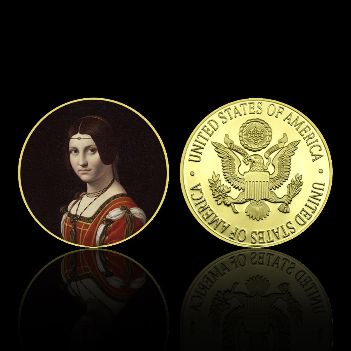 На зображенні представлені круглі сувенірні монети, на яких зображені відомі твори мистецтва та портрети, пов“язані з Леонардо так Вінчі. Серед них можна побачити: