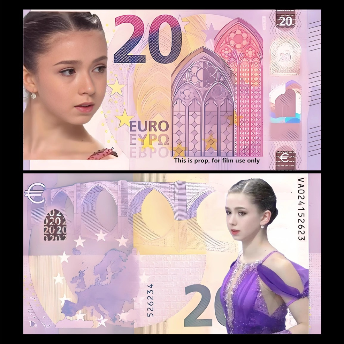 На зображенні представлена сувенірна банкнота номіналом 20 євро, виготовлена в стилі банкноти 20 євро, але із зображенням російської фігурки Камілли валиєвої.