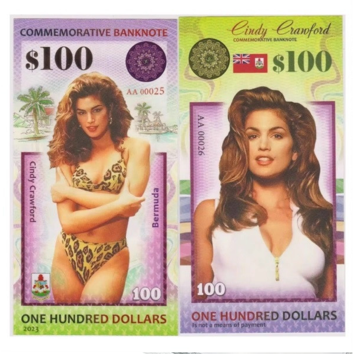 Сувенірна банкнота 100 доларів 2023 Бермудських островів “Сінді Кроуфорд“. сувенір у колекцію.Cindy