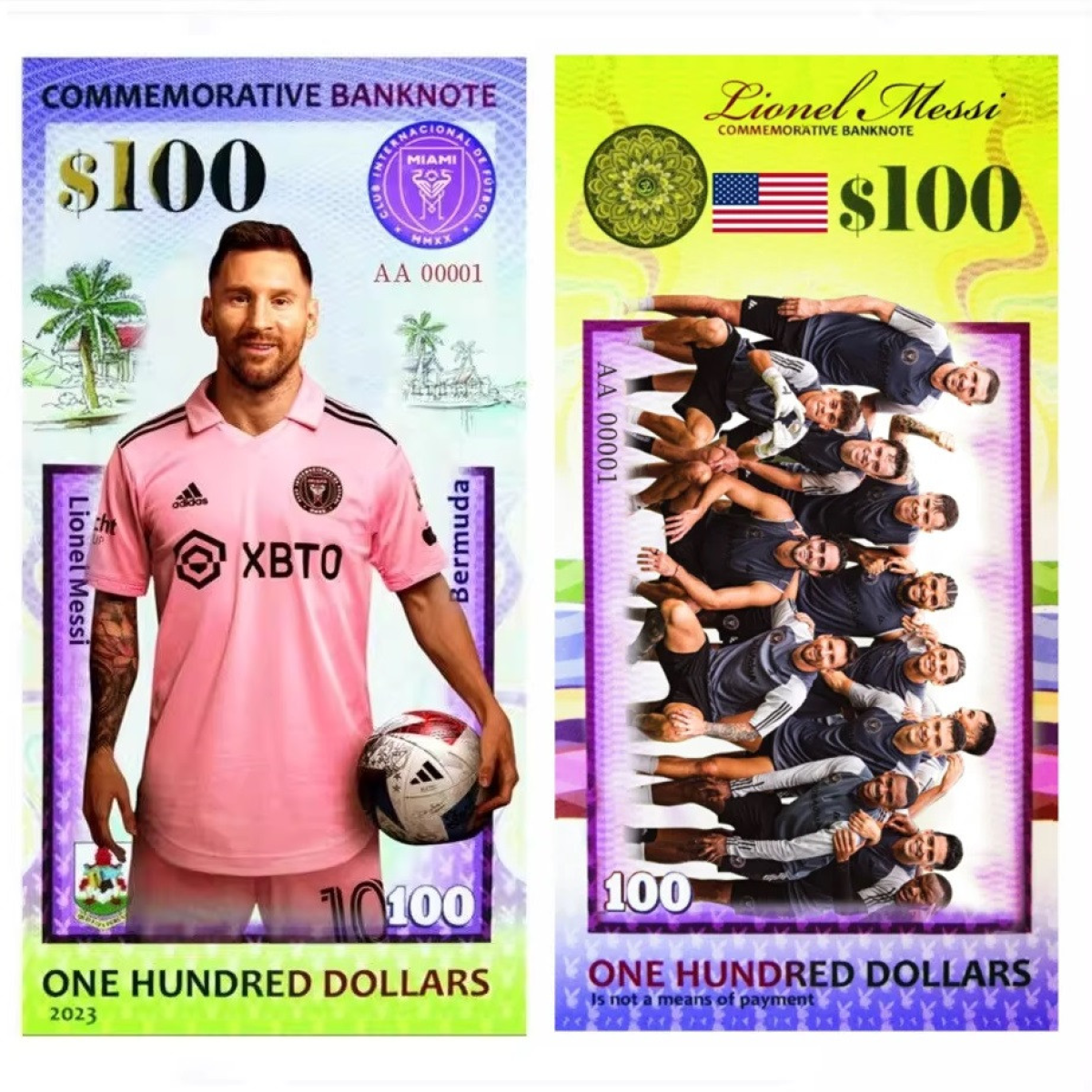 На зображенні представлені дві пам“ятні банкноти номіналом 100 доларів, присвячені Ліонелю Мессі. (турнір Мессі в Маямі)